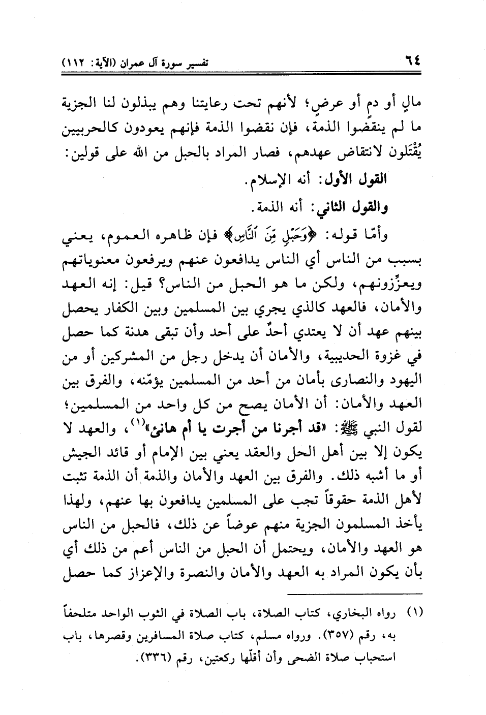 وأمّا قوله: {وَحَبْلٍ مِنَ النَّاسِ} فإن ظاهره العموم، يعني بسبب من الناس أي الناس يدافعون عنهم ويرفعون معنوياتهم ويعزِّزونهم، ولكن ما هو الحبل من الناس؟ قيل: إنه العهد والأمان، فالعهد كالذي يجري بين المسلمين وبين الكفار يحصل بينهم عهد أن لا يعتدي أحدٌ على أحد وأن تبقى هدنة كما حصل في غزوة الحديبية، والأمان أن يدخل رجل من المشركين أو من اليهود والنصارى بأمان من أحد من المسلمين يؤمّنه، والفرق بين العهد والأمان: أن الأمان يصح من كل واحد من المسلمين؛ لقول النبي - صلى الله عليه وسلم -: "قد أجرنا من أجرت يا أم هانئ" (¬١)، والعهد لا يكون إلا بين أهل الحل والعقد يعني بين الإِمام أو قائد الجيش أو ما أشبه ذلك. والفرق بين العهد والأمان والذمة أن الذمة تثبت لأهل الذمة حقوقا تجب على المسلمين يدافعون بها عنهم، ولهذا يأخذ المسلمون الجزية منهم عوضًا عن ذلك، فالحبل من الناس هو العهد والأمان، ويحتمل أن الحبل من الناس أعم من ذلك أي بأن يكون المراد به العهد والأمان والنصرة والإعزاز كما حصل
