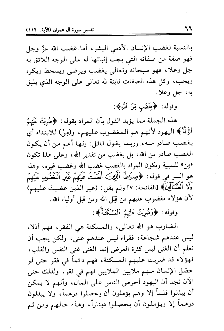 هذه الجملة مما يؤيد القول بأن المراد بقوله: {ضُرِبَتْ عَلَيْهِمُ الذِّلَّةُ} اليهود لأنهم هم المغضوب عليهم، و (مِنْ) للابتداء أي بغضب صادر منه، وربما يقول قائل: إنها أعم من أن يكون الغضب صادر من الله، بل بغضب من تقدير الله، وعلى هذا تكون "مِن" للسببية ويكون المراد بالغضب غضب الله وغضب غيره، وهذا هو السر في قوله: {صِرَاطَ الَّذِينَ أَنْعَمْتَ عَلَيْهِمْ غَيْرِ الْمَغْضُوبِ عَلَيْهِمْ وَلَا الضَّالِّينَ} [الفاتحة: ٧] ولم يقل: (غير الذين غضبتَ عليهم) لأن هؤلاء مغضوب عليهم من قِبَل الله ومن قبل أولياء الله.