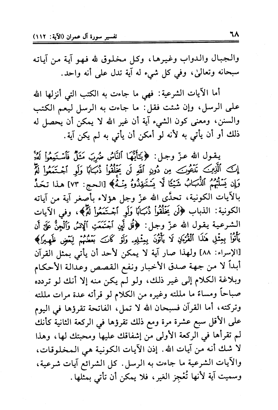 يقول الله عزّ وجل: {يَاأَيُّهَا النَّاسُ ضُرِبَ مَثَلٌ فَاسْتَمِعُوا لَهُ إِنَّ الَّذِينَ تَدْعُونَ مِنْ دُونِ اللَّهِ لَنْ يَخْلُقُوا ذُبَابًا وَلَوِ اجْتَمَعُوا لَهُ وَإِنْ يَسْلُبْهُمُ الذُّبَابُ شَيْئًا لَا يَسْتَنْقِذُوهُ مِنْهُ} [الحج: ٧٣] هذا تحَدٍّ بالآيات الكونية، تحدَّى الله عزّ وجل هؤلاء بأصغر آية من آياته الكونية: الذباب {لَنْ يَخْلُقُوا ذُبَابًا وَلَوِ اجْتَمَعُوا لَهُ}، وفي الآيات الشرعية يقول الله عزّ وجل: {قُلْ لَئِنِ اجْتَمَعَتِ الْإِنْسُ وَالْجِنُّ عَلَى أَنْ يَأْتُوا بِمِثْلِ هَذَا الْقُرْآنِ لَا يَأْتُونَ بِمِثْلِهِ وَلَوْ كَانَ بَعْضُهُمْ لِبَعْضٍ ظَهِيرًا} [الإسراء: ٨٨] ولهذا صار آية لا يمكن لأحد أن يأتي بمثل القرآن أبدًا لا من جهة صدق الأخبار ونفع القصص وعدالة الأحكام وبلاغة الكلام إلى غير ذلك، ولو لم يكن منه إلا أنك لو تردده صباحا ومساءً ما مللته وغيره من الكلام لو قرأته عدة مرات مللته وتركته، أما القرآن فسبحان الله لا تمل، الفاتحة تقرؤها في اليوم على الأقل سبع عشرة مرة ومع ذلك تقرؤها في الركعة الثانية كأنك لم تقرأها في الركعة الأولى من إشفاقك عليها ومحبتك لها، وهذا لا شك أنه من آيات الله. إذن الآيات الكونية هي المخلوقات، والآيات الشرعية ما جاءت به الرسل. كل الشرائع آيات شرعية، وسميت آية لأنها تُعْجِز الغير، فلا يمكن أن تأتي بمثلها.