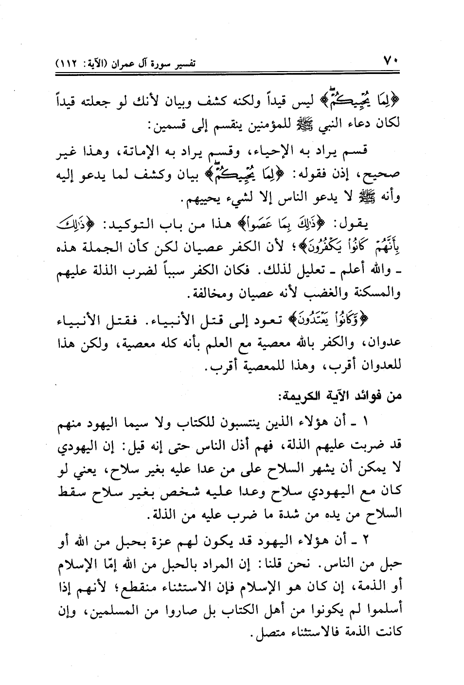٢ - أن هؤلاء اليهود قد يكون لهم عزة بحبل من الله أو حبل من الناس. نحن قلنا: إن المراد بالحبل من الله إمّا الإِسلام أو الذمة، إن كان هو الإِسلام فإن الاستثناء منقطع؛ لأنهم إذا أسلموا لم يكونوا من أهل الكتاب بل صاروا من المسلمين، وإن كانت الذمة فالاستثناء متصل.