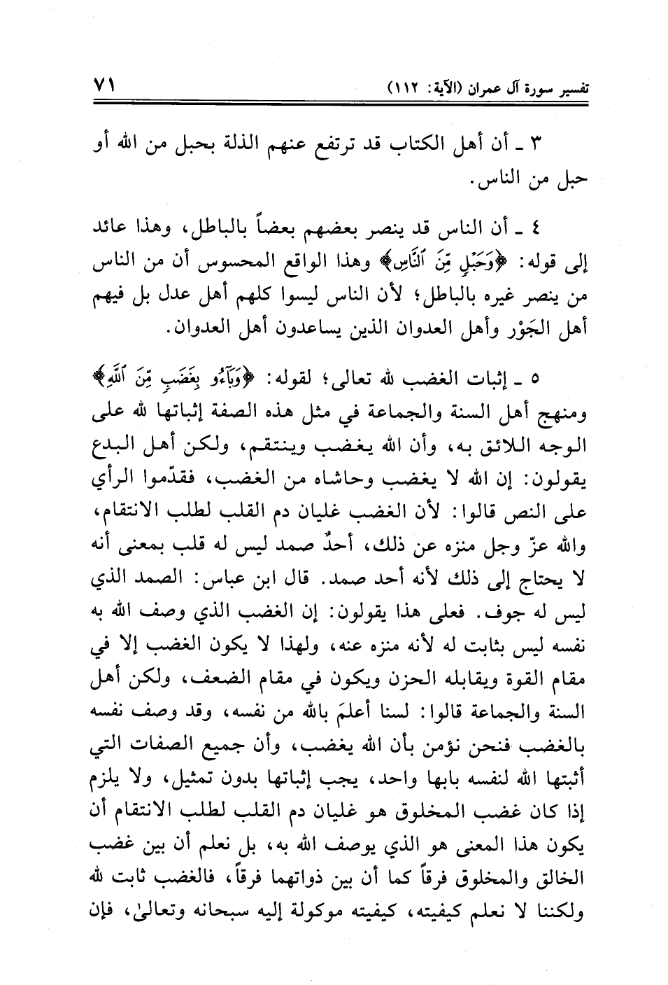 ٥ - إثبات الغضب لله تعالى؛ لقوله: {وَبَاءُوا بِغَضَبٍ مِنَ اللَّهِ} ومنهج أهل السنة والجماعة في مثل هذه الصفة إثباتها لله على الوجه اللائق به، وأن الله يغضب وينتقم، ولكن أهل البدع يقولون: إن الله لا يغضب وحاشاه من الغضب، فقدّموا الرأي على النص قالوا: لأن الغضب غليان دم القلب لطلب الانتقام، والله عزّ وجل منزه عن ذلك، أحدٌ صمد ليس له قلب بمعنى أنه لا يحتاج إلى ذلك لأنه أحد صمد. قال ابن عباس: الصمد الذي ليس له جوف. فعلى هذا يقولون: إن الغضب الذي وصف الله به نفسه ليس بثابت له لأنه منزه عنه، ولهذا لا يكون الغضب إلا في مقام القوة ويقابله الحزن ويكون في مقام الضعف، ولكن أهل السنة والجماعة قالوا: لسنا أعلمَ بالله من نفسه، وقد وصف نفسه بالغضب فنحن نؤمن بأن الله يغضب، وأن جميع الصفات التي أثبتها الله لنفسه بابها واحد، يجب إثباتها بدون تمثيل، ولا يلزم إذا كان غضب المخلوق هو غليان دم القلب لطلب الانتقام أن يكون هذا المعنى هو الذي يوصف الله به، بل نعلم أن بين غضب الخالق والمخلوق فرقًا كما أن بين ذواتهما فرقًا، فالغضب ثابت لله ولكننا لا نعلم كيفيته، كيفيته موكولة إليه سبحانه وتعالى، فإن