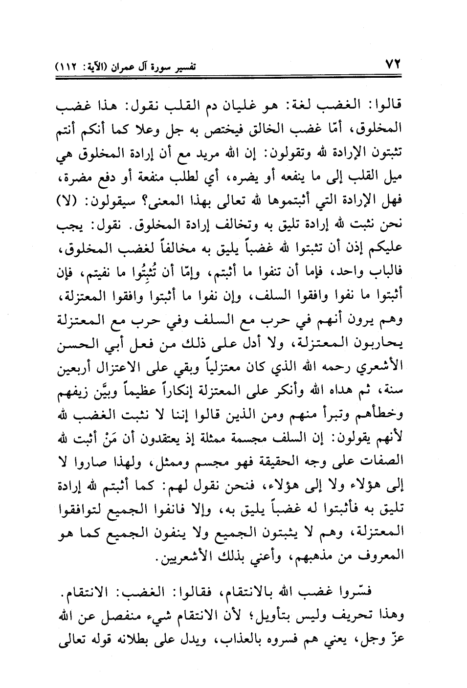 قالوا: الغضب لغة: هو غليان دم القلب نقول: هذا غضب المخلوق، أمّا غضب الخالق فيختص به جل وعلا كما أنكم أنتم تثبتون الإرادة لله وتقولون: إن الله مريد مع أن إرادة المخلوق هي ميل القلب إلى ما ينفعه أو يضره، أي لطلب منفعة أو دفع مضرة، فهل الإرادة التي أثبتموها لله تعالى بهذا المعنى؟ سيقولون: (لا) نحن نثبت لله إرادة تليق به وتخالف إرادة المخلوق. نقول: يجب عليكم إذن أن تثبتوا لله غضبا يليق به مخالفًا لغضب المخلوق، فالباب واحد، فإما أن تنفوا ما أثبتم، وإمّا أن تُثبِتُوا ما نفيتم، فإن أثبتوا ما نفوا وافقوا السلف، وإن نفوا ما أثبتوا وافقوا المعتزلة، وهم يرون أنهم في حرب مع السلف وفي حرب مع المعتزلة يحاربون المعتزلة، ولا أدل على ذلك من فعل أبي الحسن الأشعري رحمه الله الذي كان معتزليا وبقي على الاعتزال أربعين سنة، ثم هداه الله وأنكر على المعتزلة إنكارا عظيما وبيَّن زيفهم وخطأهم وتبرأ منهم ومن الذين قالوا إننا لا نثبت الغضب لله لأنهم يقولون: إن السلف مجسمة ممثلة إذ يعتقدون أن مَنْ أثبت لله الصفات على وجه الحقيقة فهو مجسم وممثل، ولهذا صاروا لا إلى هؤلاء ولا إلى هؤلاء، فنحن نقول لهم: كما أثبتم لله إرادة تليق به فأثبتوا له غضبًا يليق به، وإلا فانفوا الجميع لتوافقوا المعتزلة، وهم لا يثبتون الجميع ولا ينفون الجميع كما هو المعروف من مذهبهم، وأعني بذلك الأشعريين.