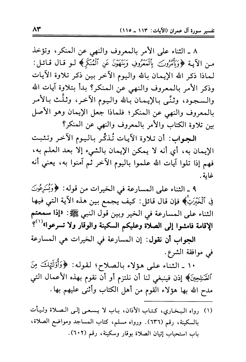 ٨ - الثناء على الأمر بالمعروف والنهي عن المنكر، وتؤخذ من الآية {وَيَأْمُرُونَ بِالْمَعْرُوفِ وَيَنْهَوْنَ عَنِ الْمُنْكَرِ} لو قال قائل: لماذا ذكر الله الإيمان بالله واليوم الآخر بين ذكر تلاوة الآيات وذكر الأمر بالمعروف والنهي عن المنكر؟ بدأ بتلاوة آيات الله والسجود، وثنَّى بالإيمان بالله واليوم الآخر، وثلَّث بالأمر بالمعروف والنهي عن المنكر؛ فلماذا جعل الإيمان وهو الأصل بين تلاوة الكتاب والأمر بالمعروف والنهي عن المنكر؟