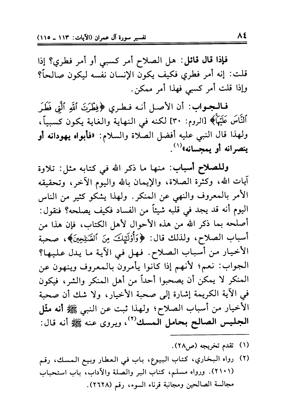 وللصلاح أسباب: منها ما ذكر الله في كتابه مثل: تلاوة آيات الله، وكثرة الصلاة، والإيمان بالله واليوم الآخر، وتحقيقه الأمر بالمعروف والنهي عن المنكر. ولهذا يشكو كثير من الناس اليوم أنه قد يجد في قلبه شيئًا من الفساد فكيف يصلحه؟ فنقول: أصلحه بما ذكر الله من هذه الأحوال لأهل الكتاب، فإن هذا من أسباب الصلاح، ولذلك قال: {وَأُولَئِكَ مِنَ الصَّالِحِينَ}، صحبة الأخيار من أسباب الصلاح. فهل في الآية ما يدل عليها؟ الجواب: نعم؛ لأنهم إذا كانوا يأمرون بالمعروف وينهون عن المنكر لا يمكن أن يصحبوا أحدًا من أهل المنكر والشر، فيكون في الآية الكريمة إشارة إلى صحبة الأخيار، ولا شك أن صحبة الأخيار من أسباب الصلاح؛ ولهذا ثبت عن النبي - صلى الله عليه وسلم - أنّه مثّل الجليس الصالح بحامل المسك (¬٢)، ويروى عنه - صلى الله عليه وسلم - أنه قال: