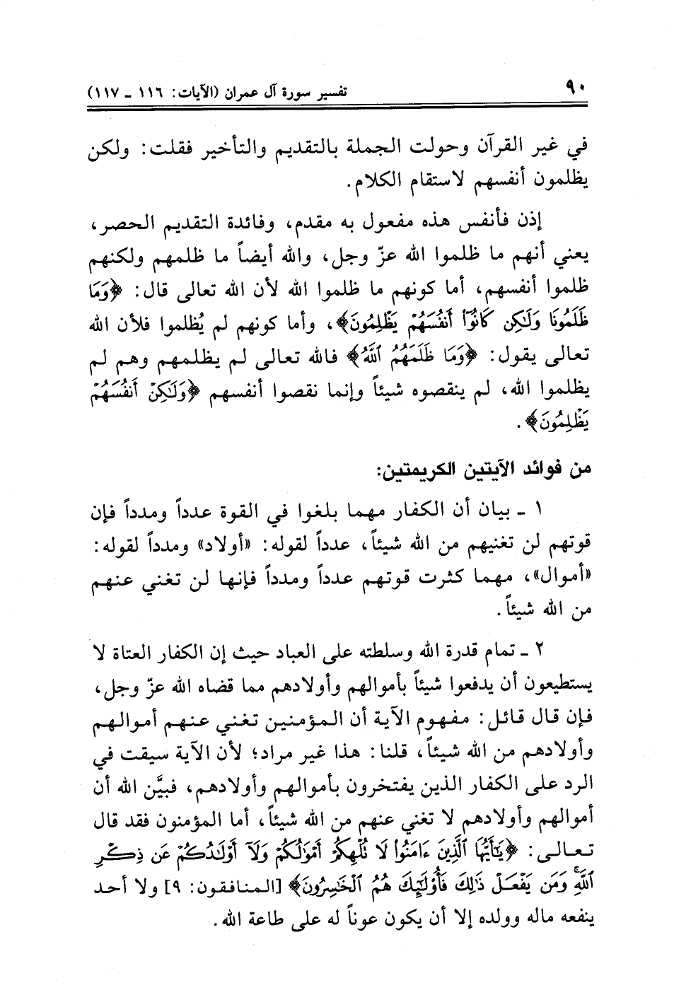 إذن فأنفس هذه مفعول به مقدم، وفائدة التقديم الحصر، يعني أنهم ما ظلموا الله عزّ وجل، والله أيضًا ما ظلمهم ولكنهم ظلموا أنفسهم، أما كونهم ما ظلموا الله لأن الله تعالى قال: {وَمَا ظَلَمَهُمُ اللَّهُ وَلَكِنْ أَنْفُسَهُمْ يَظْلِمُونَ}، وأما كونهم لم يُظلموا فلأن الله تعالى يقول: {وَمَا ظَلَمَهُمُ اللَّهُ} فالله تعالى لم يظلمهم وهم لم يظلموا الله، لم ينقصوه شيئًا وإنما نقصوا أنفسهم {وَلَكِنْ أَنْفُسَهُمْ يَظْلِمُونَ}.