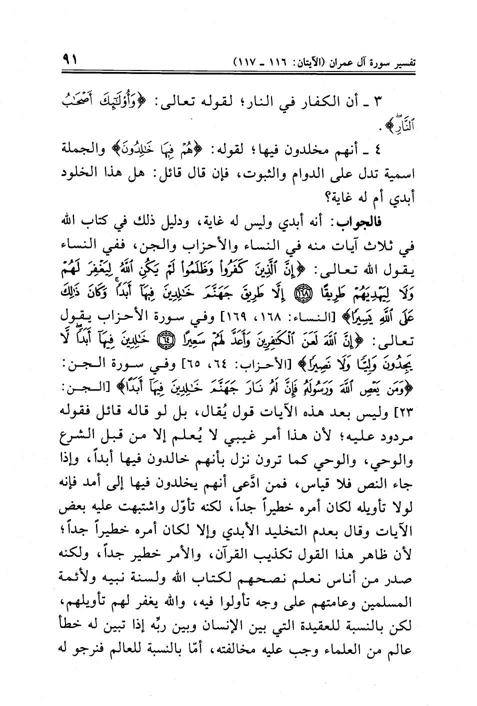 فالجواب: أنه أبدي وليس له غاية، ودليل ذلك في كتاب الله في ثلاث آيات منه في النساء والأحزاب والجن، ففي النساء يقول الله تعالى: {إِنَّ الَّذِينَ كَفَرُوا وَظَلَمُوا لَمْ يَكُنِ اللَّهُ لِيَغْفِرَ لَهُمْ وَلَا لِيَهْدِيَهُمْ طَرِيقًا (١٦٨) إِلَّا طَرِيقَ جَهَنَّمَ خَالِدِينَ فِيهَا أَبَدًا وَكَانَ ذَلِكَ عَلَى اللَّهِ يَسِيرًا} [النساء: ١٦٨، ١٦٩] وفي سورة الأحزاب يقول تعالى: {إِنَّ اللَّهَ لَعَنَ الْكَافِرِينَ وَأَعَدَّ لَهُمْ سَعِيرًا (٦٤) خَالِدِينَ فِيهَا أَبَدًا لَا يَجِدُونَ وَلِيًّا وَلَا نَصِيرًا} [الأحزاب: ٦٤، ٦٥] وفي سورة الجن: {وَمَنْ يَعْصِ اللَّهَ وَرَسُولَهُ فَإِنَّ لَهُ نَارَ جَهَنَّمَ خَالِدِينَ فِيهَا أَبَدًا} [الجن: ٢٣] وليس بعد هذه الآيات قول يُقال، بل لو قاله قائل فقوله مردود عليه؛ لأن هذا أمر غيبي لا يُعلم إلا من قبل الشرع والوحي، والوحي كما ترون نزل بأنهم خالدون فيها أبدًا، وإذا جاء النص فلا قياس، فمن ادَّعى أنهم يخلدون فيها إلى أمد فإنه لولا تأويله لكان أمره خطيرًا جدًا، لكنه تأوّل واشتبهت عليه بعض الآيات وقال بعدم التخليد الأبدي وإلا لكان أمره خطيرًا جدًا؛ لأن ظاهر هذا القول تكذيب القرآن، والأمر خطير جدًا، ولكنه صدر من أناس نعلم نصحهم لكتاب الله ولسنة نبيه ولأئمة المسلمين وعامتهم على وجه تأولوا فيه، والله يغفر لهم تأويلهم، لكن بالنسبة للعقيدة التي بين الإنسان وبين ربِّه إذا تبين له خطأ عالم من العلماء وجب عليه مخالفته، أمّا بالنسبة للعالم فنرجو له