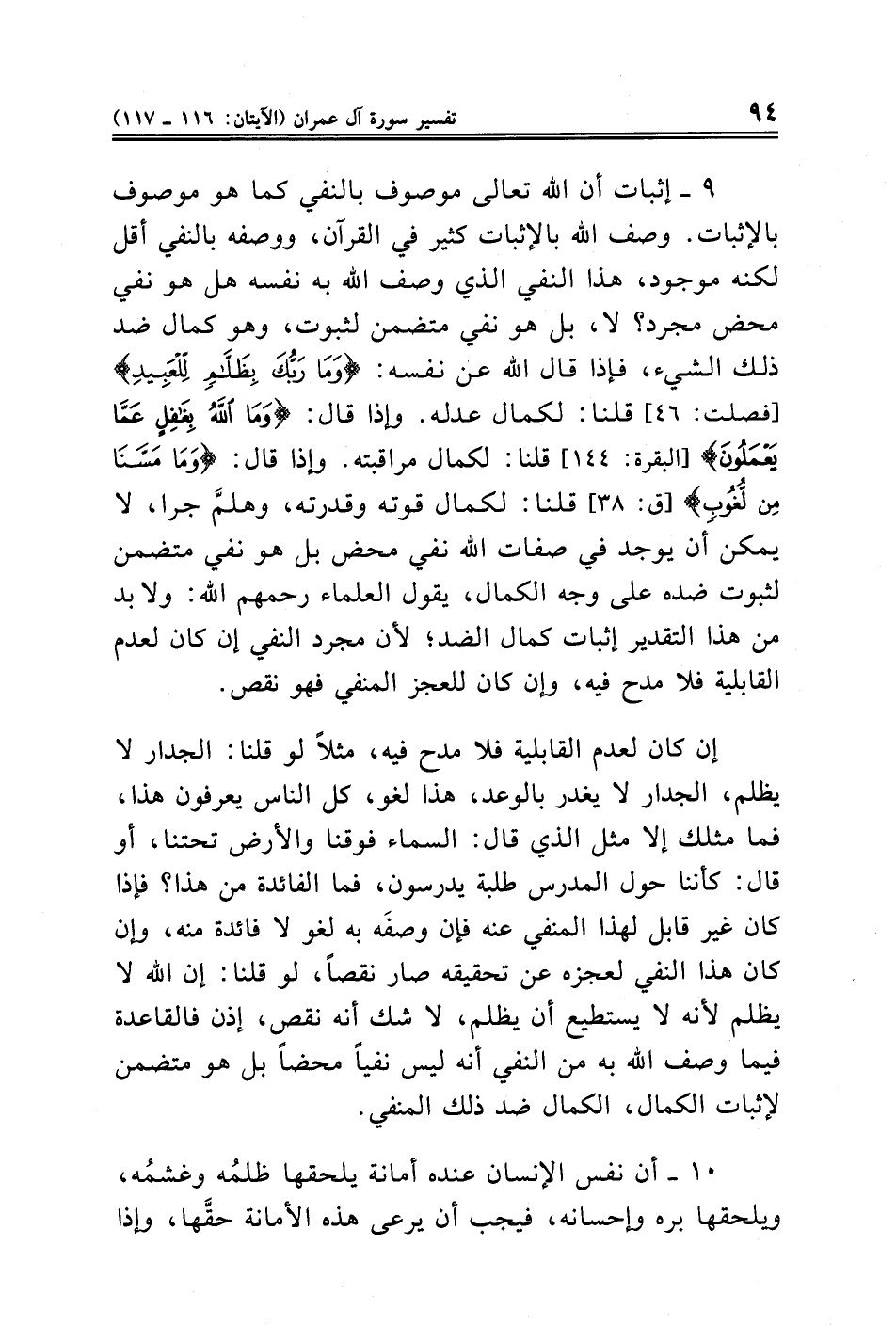 ٩ - إثبات أن الله تعالى موصوف بالنفي كما هو موصوف بالإثبات. وصف الله بالإثبات كثير في القرآن، ووصفه بالنفي أقل لكنه موجود، هذا النفي الذي وصف الله به نفسه هل هو نفي محض مجرد؟ لا، بل هو نفي متضمن لثبوت، وهو كمال ضد ذلك الشيء، فإذا قال الله عن نفسه: {وَمَا رَبُّكَ بِظَلَّامٍ لِلْعَبِيدِ} [فصلت: ٤٦] قلنا: لكمال عدله. وإذا قال: {وَمَا اللَّهُ بِغَافِلٍ عَمَّا يَعْمَلُونَ} [البقرة: ١٤٤] قلنا: لكمال مراقبته. وإذا قال: {وَمَا مَسَّنَا مِنْ لُغُوبٍ} [ق: ٣٨] قلنا: لكمال قوته وقدرته، وهلمَّ جرا، لا يمكن أَن يوجد في صفات الله نفي محض بل هو نفي متضمن لثبوت ضده على وجه الكمال، يقول العلماء رحمهم الله: ولابد من هذا التقدير إثبات كمال الضد؛ لأن مجرد النفي إن كان لعدم القابلية فلا مدح فيه، وإن كان للعجز المنفي فهو نقص.