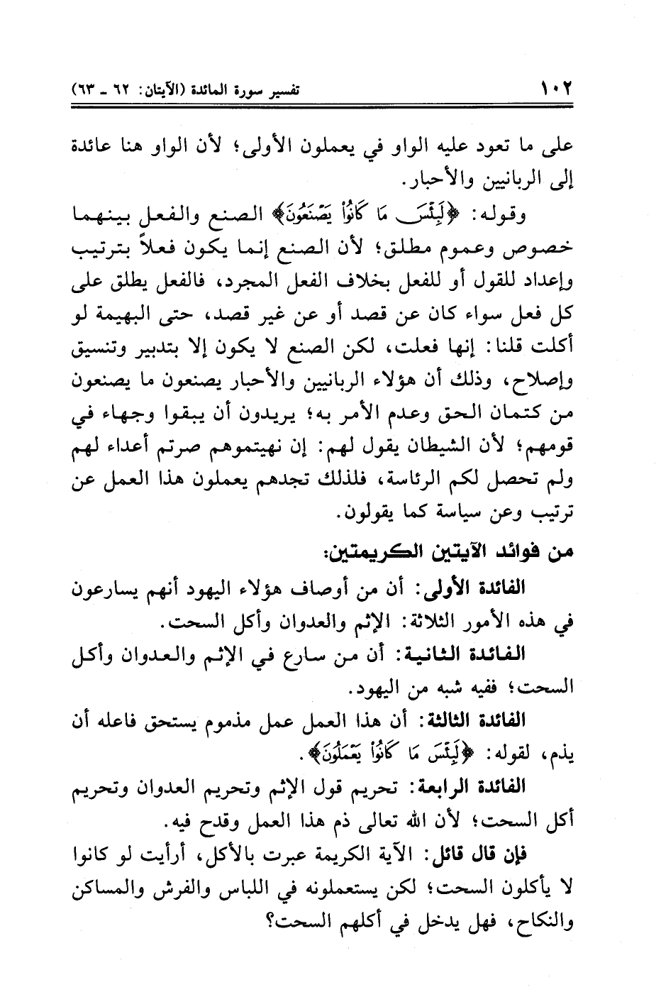 الفائدة الرابعة: تحريم قول الإثم وتحريم العدوان وتحريم أكل السحت؛ لأن الله تعالى ذم هذا العمل وقدح فيه.