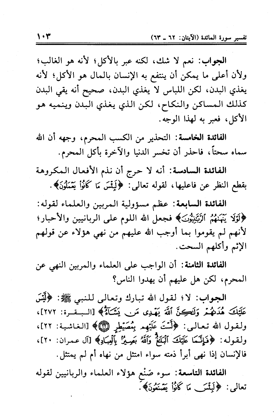 الفائدة السابعة: عظم مسؤولية المربين والعلماء لقوله: {لَوْلَا يَنْهَاهُمُ الرَّبَّانِيُّونَ} فجعل الله اللوم على الربانيين والأحبار؛ لأنهم لم يقوموا بما أوجب الله عليهم من نهي هؤلاء عن قولهم الإثم وأكلهم السحت.