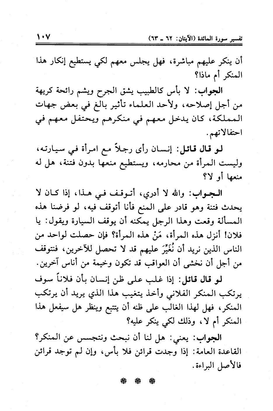 الجواب: والله لا أدري، أتوقف في هذا، إذا كان لا يحدث فتنة وهو قادر على المنع فأنا أتوقف فيه، لو فرضنا هذه المسألة وقعت وهذا الرجل يمكنه أن يوقف السيارة ويقول: يا فلان! أنزل هذه المرأة، مَنْ هذه المرأة؟ فإن حصلت لواحد من الناس الذين نريد أن نُغَيِّرَ عليهم قد لا تحصل للآخرين، فنتوقف من أجل أن نخشى أن العواقب قد تكون وخيمة من أناس آخرين.