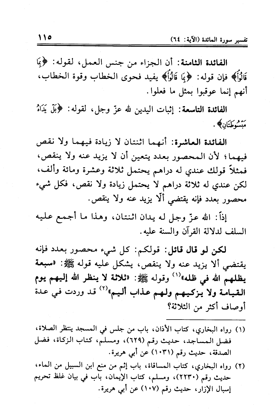 الفائدة التاسعة: إثبات اليدين لله عزّ وجل، لقوله: {بَلْ يَدَاهُ مَبْسُوطَتَانِ}.