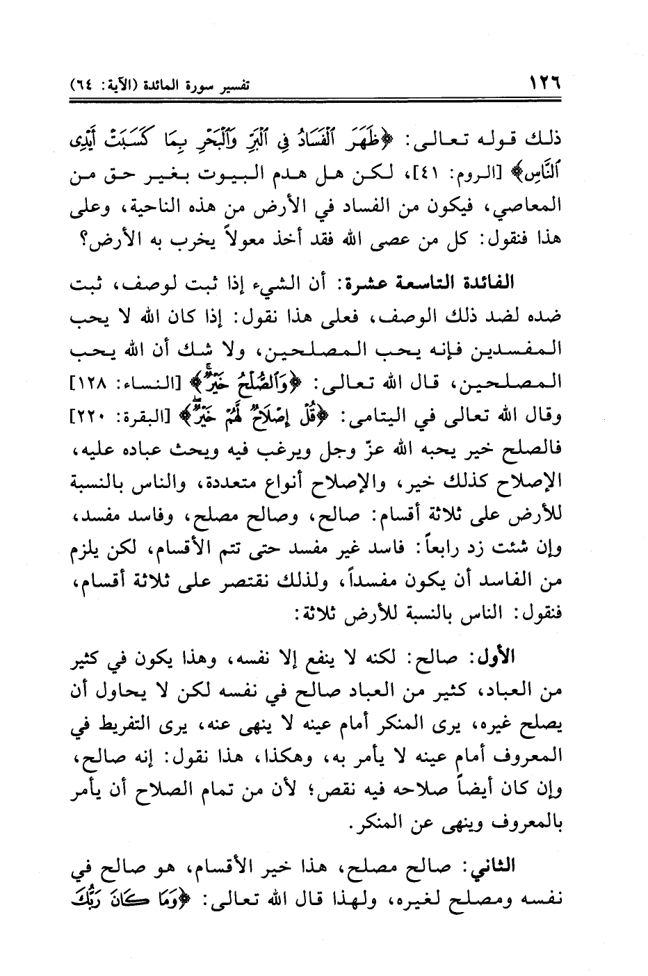 الفائدة التاسعة عشرة: أن الشيء إذا ثبت لوصف، ثبت ضده لضد ذلك الوصف، فعلى هذا نقول: إذا كان الله لا يحب المفسدين فإنه يحب المصلحين، ولا شك أن الله يحب المصلحين، قال الله تعالى: {وَالصُّلْحُ خَيْرٌ} [النساء: ١٢٨] وقال الله تعالى في اليتامى: {قُلْ إِصْلَاحٌ لَهُمْ خَيْرٌ} [البقرة: ٢٢٠] فالصلح خير يحبه الله عزّ وجل ويرغب فيه ويحث عباده عليه، الإصلاح كذلك خير، والإصلاح أنواع متعددة، والناس بالنسبة للأرض على ثلاثة أقسام: صالح، وصالح مصلح، وفاسد مفسد، وإن شئت زد رابعًا: فاسد غير مفسد حتى تتم الأقسام، لكن يلزم من الفاسد أن يكون مفسدًا، ولذلك نقتصر على ثلاثة أقسام، فنقول: الناس بالنسبة للأرض ثلاثة: