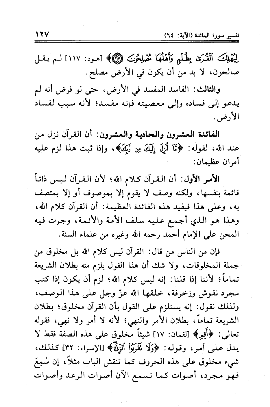 فإن من الناس من قال: القرآن ليس كلام الله بل مخلوق من جملة المخلوقات، ولا شك أن هذا القول يلزم منه بطلان الشريعة تمامًا؛ لأننا إذا قلنا: إنه ليس كلام الله؛ لزم أن يكون إذا كتب مجرد نقوش وزخرفة، خلقها الله عزّ وجل على هذا الوصف، ولذلك نقول: إنه يستلزم على القول بأن القرآن مخلوق؛ بطلان الشريعة تمامًا، بطلان الأمر والنهي؛ لأنه لا أمر ولا نهي، فقوله تعالى: {أَقِمِ} [لقمان: ١٧] شيئًا مخلوق على هذه الصفة فقط لا يدل على أمر، وقوله: {وَلَا تَقْرَبُوا الزِّنَا} [الإسراء: ٣٢] كذلك، شيء مخلوق على هذه الحروف كما تنقش الباب مثلًا، إن سُمِعَ فهو مجرد، أصوات كما نسمع الآن أصوات الرعد وأصوات