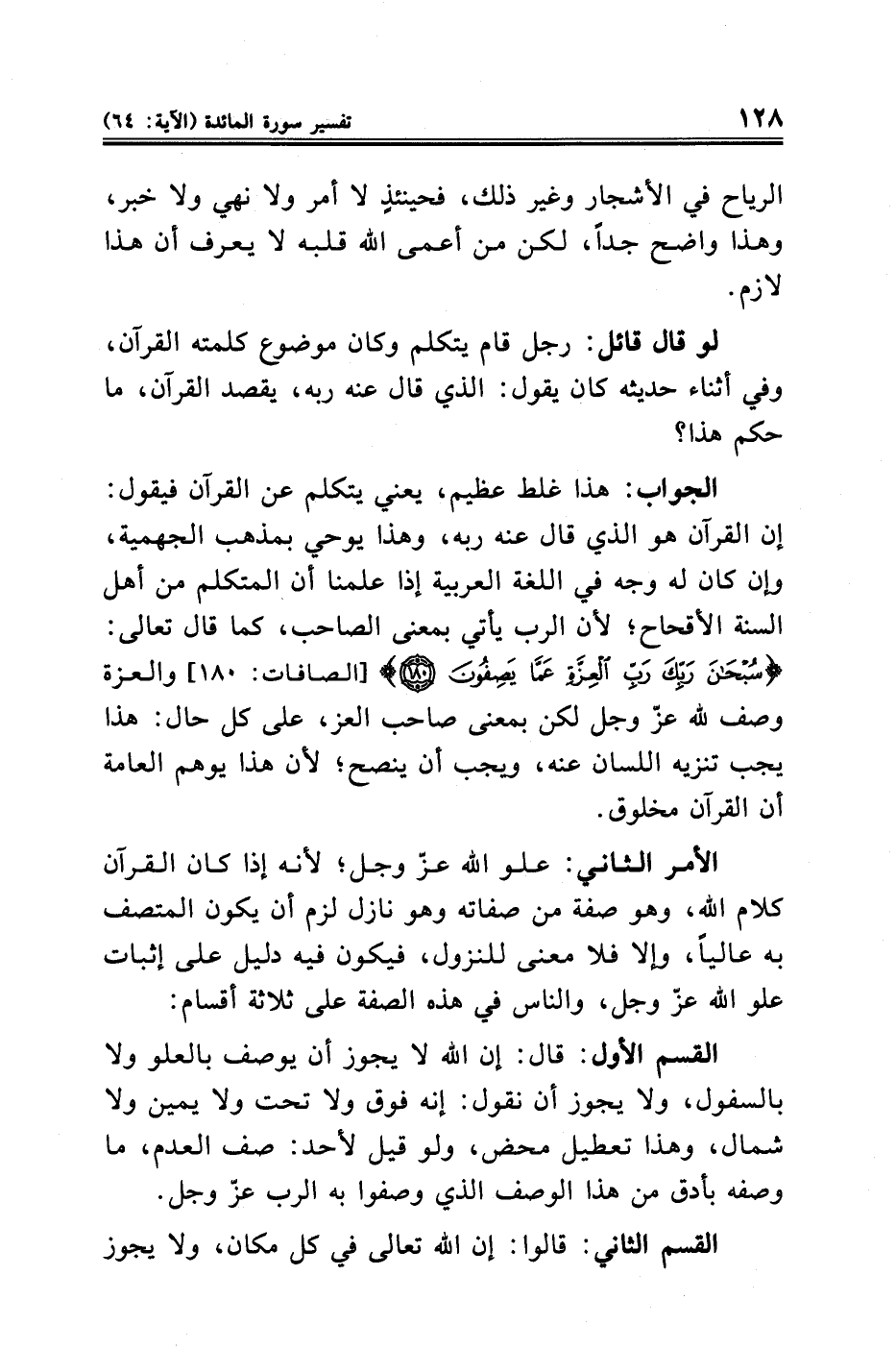 الأمر الثاني: علو الله عزّ وجل؛ لأنه إذا كان القرآن كلام الله، وهو صفة من صفاته وهو نازل لزم أن يكون المتصف به عاليًا، وإلا فلا معنى للنزول، فيكون فيه دليل على إثبات علو الله عزّ وجل، والناس في هذه الصفة على ثلاثة أقسام: