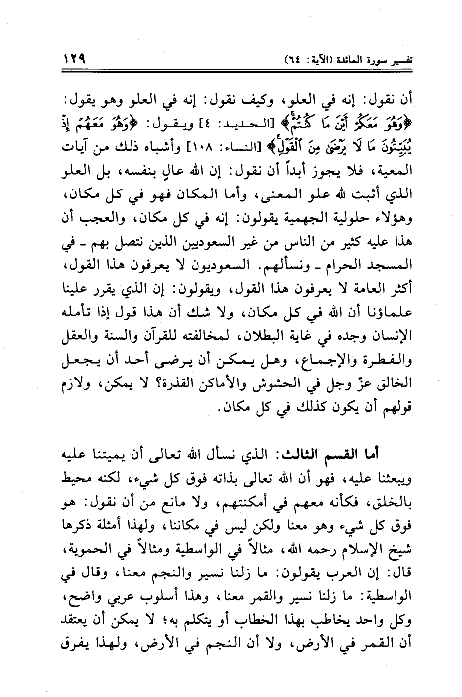 أن نقول: إنه في العلو، وكيف نقول: إنه في العلو وهو يقول: {وَهُوَ مَعَكُمْ أَيْنَ مَا كُنْتُمْ} [الحديد: ٤] ويقول: {وَهُوَ مَعَهُمْ إِذْ يُبَيِّتُونَ مَا لَا يَرْضَى مِنَ الْقَوْلِ} [النساء: ١٠٨] وأشباه ذلك من آيات المعية، فلا يجوز أبدًا أن نقول: إن الله عالٍ بنفسه، بل العلو الذي أثبت لله علو المعنى، وأما المكان فهو في كل مكان، وهؤلاء حلولية الجهمية يقولون: إنه في كل مكان، والعجب أن هذا عليه كثير من الناس من غير السعوديين الذين نتصل بهم -في المسجد الحرام- ونسألهم. السعوديون لا يعرفون هذا القول، أكثر العامة لا يعرفون هذا القول، ويقولون: إن الذي يقرر علينا علماؤنا أن الله في كل مكان، ولا شك أن هذا قول إذا تأمله الإنسان وجده في غاية البطلان، لمخالفته للقرآن والسنة والعقل والفطرة والإجماع، وهل يمكن أن يرضى أحد أن يجعل الخالق عزّ وجل في الحشوش والأماكن القذرة؟ لا يمكن، ولازم قولهم أن يكون كذلك في كل مكان.