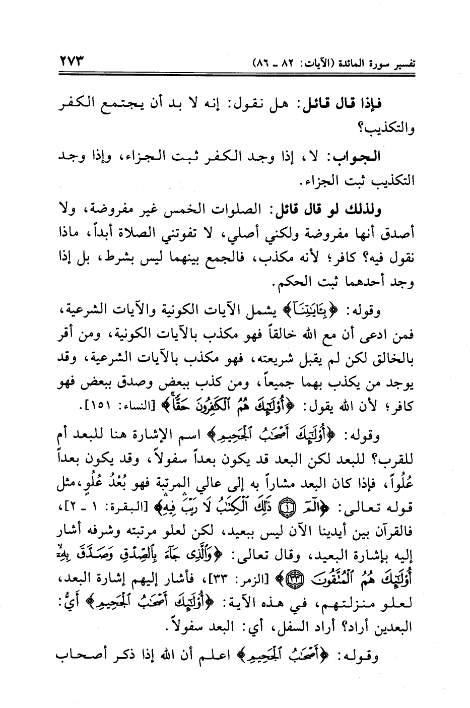 وقوله: {أُولَئِكَ أَصْحَابُ الْجَحِيمِ} اسم الإشارة هنا للبعد أم للقرب؟ للبعد لكن البعد قد يكون بعدًا سفولًا، وقد يكون بعدًا عُلُوًا، فإذا كان البعد مشارًا به إلى عالي المرتبة فهو بُعْدُ عُلُوٍ، مثل قوله تعالى: {الم (١) ذَلِكَ الْكِتَابُ لَا رَيْبَ فِيهِ} [البقرة: ١ - ٢]، فالقرآن بين أيدينا الآن ليس ببعيد، لكن لعلو مرتبته وشرفه أشار إليه بإشارة البعيد، وقال تعالى: {وَالَّذِي جَاءَ بِالصِّدْقِ وَصَدَّقَ بِهِ أُولَئِكَ هُمُ الْمُتَّقُونَ (٣٣)} [الزمر: ٣٣] , فأشار إليهم إشارة البعد، لعلو منزلتهم، في هذه الآية: {أُولَئِكَ أَصْحَابُ الْجَحِيمِ} أَيُّ: البعدين أراد؟ أراد السفل، أي: البعد سفولًا.