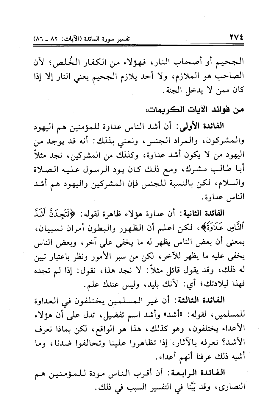 الفائدة الأولى: أن أشد الناس عداوة للمؤمنين هم اليهود والمشركون، والمراد الجنس، ونعني بذلك: أنه قد يوجد من اليهود من لا يكون أشد عداوة، وكذلك من المشركين، نجد مثلًا أبا طالب مشرك، ومع ذلك كان يود الرسول عليه الصلاة والسلام، لكن بالنسبة للجنس فإن المشركين واليهود هم أشد الناس عداوة.