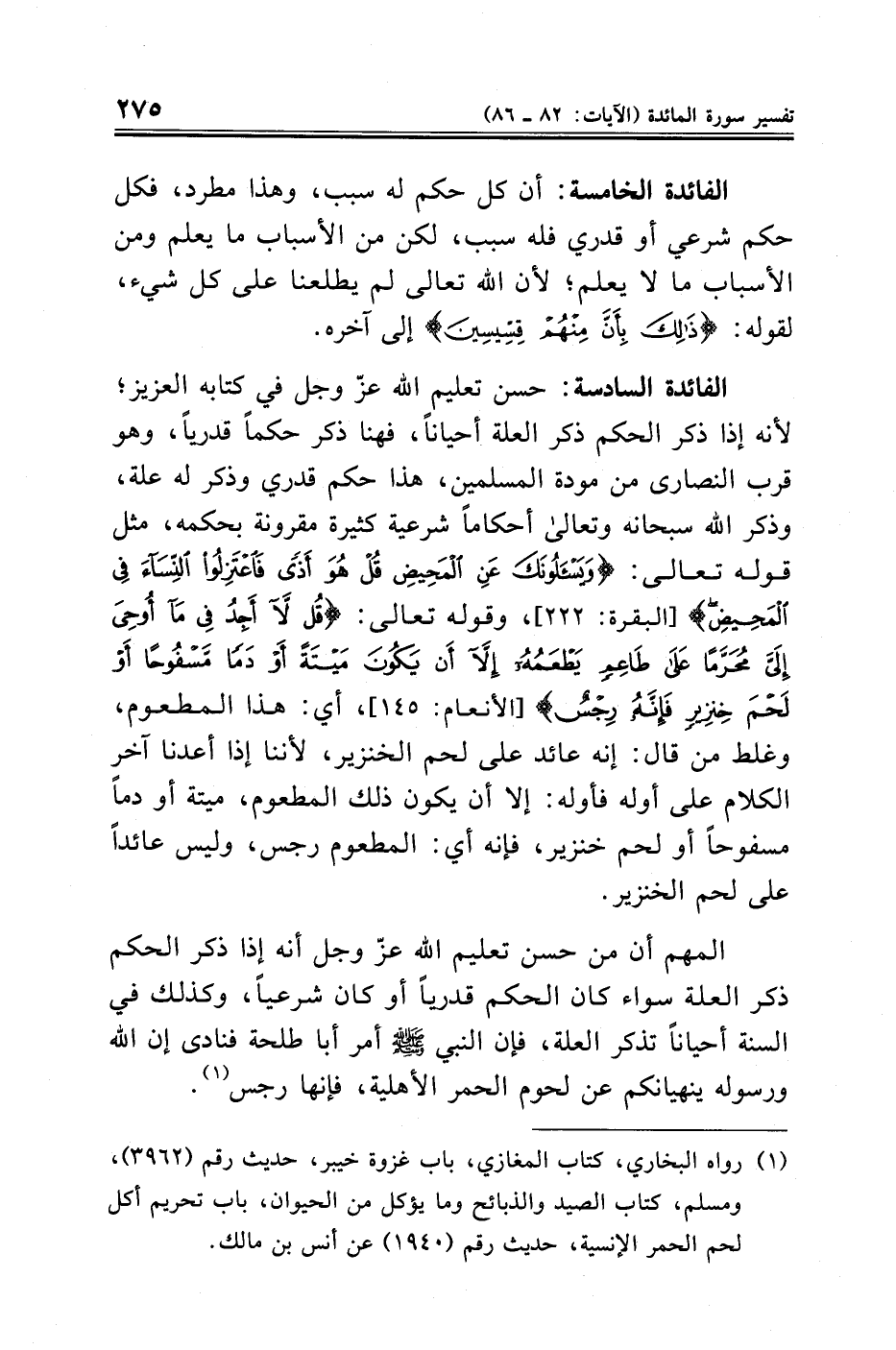 الفائدة السادسة: حسن تعليم الله عزّ وجل في كتابه العزيز؛ لأنه إذا ذكر الحكم ذكر العلة أحيانًا، فهنا ذكر حكمًا قدريًّا، وهو قرب النصارى من مودة المسلمين، هذا حكم قدري وذكر له علة، وذكر الله سبحانه وتعالى أحكامًا شرعية كثيرة مقرونة بحكمه، مثل قوله تعالى: {وَيَسْأَلُونَكَ عَنِ الْمَحِيضِ قُلْ هُوَ أَذًى فَاعْتَزِلُوا النِّسَاءَ فِي الْمَحِيضِ} [البقرة: ٢٢٢]، وقوله تعالى: {قُلْ لَا أَجِدُ فِي مَا أُوحِيَ إِلَيَّ مُحَرَّمًا عَلَى طَاعِمٍ يَطْعَمُهُ إِلَّا أَنْ يَكُونَ مَيْتَةً أَوْ دَمًا مَسْفُوحًا أَوْ لَحْمَ خِنْزِيرٍ فَإِنَّهُ رِجْسٌ} [الأنعام: ١٤٥]، أي: هذا المطعوم، وغلط من قال: إنه عائد على لحم الخنزير، لأننا إذا أعدنا آخر الكلام على أوله فأوله: إلا أن يكون ذلك المطعوم، ميتة أو دمًا مسفوحًا أو لحم خنزير، فإنه أي: المطعوم رجس، وليس عائدًا على لحم الخنزير.