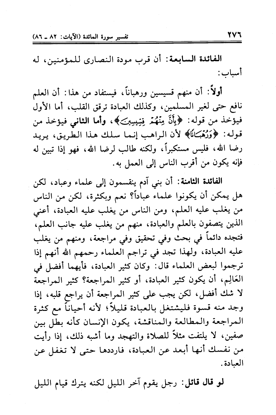 أولًا: أن منهم قسيسين ورهبانًا، فيستفاد من هذا: أن العلم نافع حتى لغير المسلمين، وكذلك العبادة ترقق القلب، أما الأول فيؤخذ من قوله: {بِأَنَّ مِنْهُمْ قِسِّيسِينَ}، وأما الثماني فيؤخذ من قوله: {وَرُهْبَانًا} لأن الراهب إنما سلك هذا الطريق، يريد رضا الله، فليس مستكبرًا، ولكنه طالب لرضا الله، فهو إذا تبين له فإنه يكون من أقرب الناس إلى العمل به.