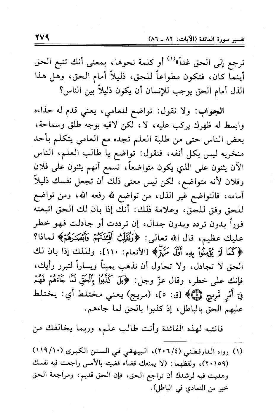 الجواب: ولا نقول: تواضع للعامي، يعني قدم له حذاءه وابسط له ظهرك يركب عليه، لا، لكن لاقيه بوجه طلق وسماحة، بعض الناس حتى من طلبة العلم تجده مع العامي يتكلم بأحد منخريه ليس بكل أنفه، فنقول: تواضع يا طالب العلم، الناس الآن يثنون على الذي يكون متواضعًا، نسمع أنهم يثنون على فلان وفلان لأنه متواضع، لكن ليس معنى ذلك أن تجعل نفسك ذليلًا أمامه، فالتواضع غير الذل، من تواضع لله رفعه الله، ومن تواضع للحق وفق للحق، وعلامة ذلك: أنك إذا بان لك الحق اتبعته فورًا بدون تردد وبدون جدال، إن ترددت أو جادلت فهو خطر عليك عظيم، قال الله تعالى: {وَنُقَلِّبُ أَفْئِدَتَهُمْ وَأَبْصَارَهُمْ} لماذا؟ {كَمَا لَمْ يُؤْمِنُوا بِهِ أَوَّلَ مَرَّةٍ} [الأنعام: ١١٠]، ولذلك إذا بان لك الحق لا تجادل، ولا تحاول أن نذهب يمينًا وشمالًا لتبرر رأيك، فإنك على خطر، وقال عزّ وجل: {بَلْ كَذَّبُوا بِالْحَقِّ لَمَّا جَاءَهُمْ فَهُمْ فِي أَمْرٍ مَرِيجٍ (٥)} [ق: ٥]، (مريج) يعني مختلط أي: يختلط عليهم الحق بالباطل، إذ كذبوا بالحق لما جاءهم.