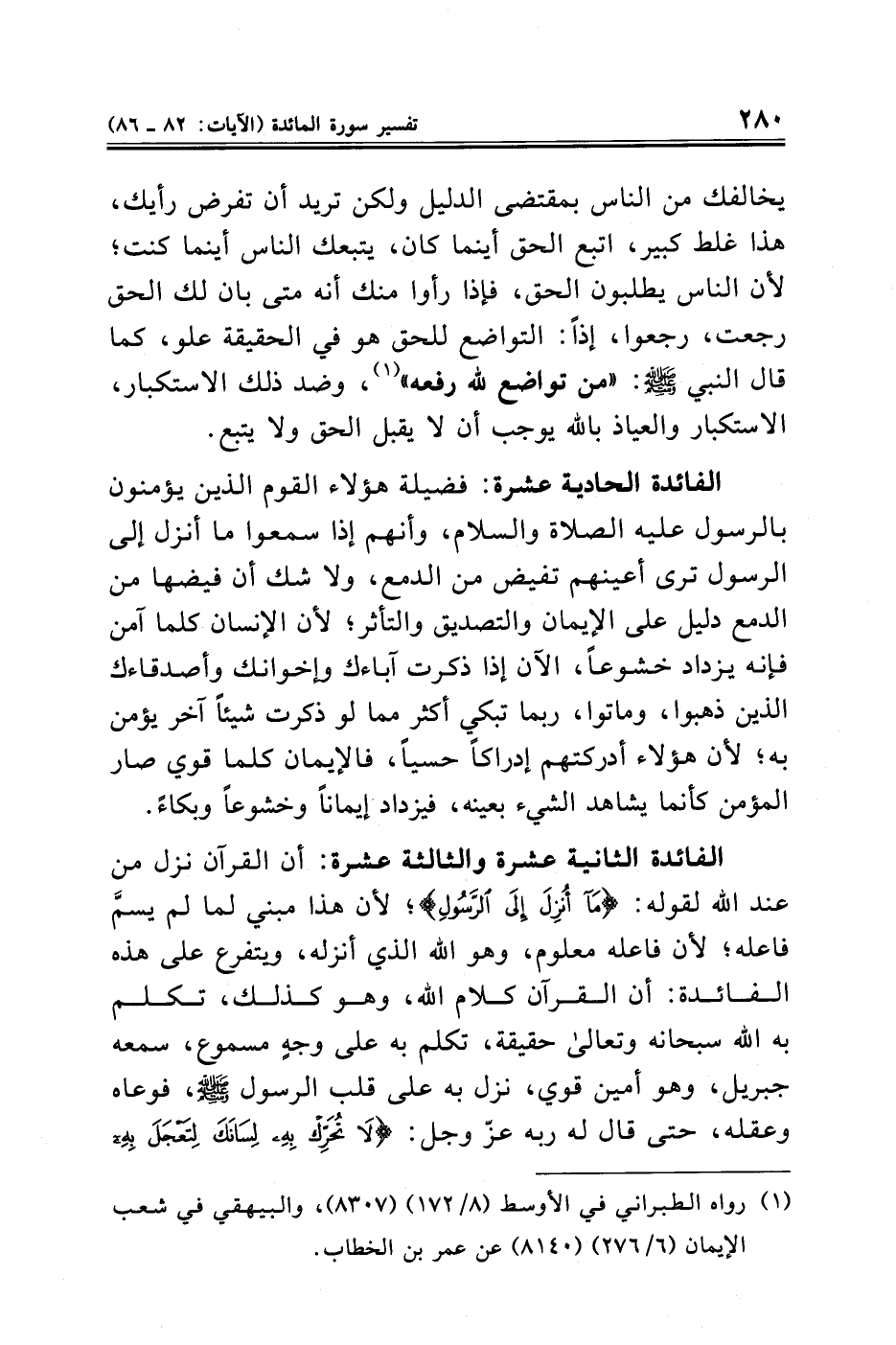 الفائدة الحادية عشرة: فضيلة هؤلاء القوم الذين يؤمنون بالرسول عليه الصلاة والسلام، وأنهم إذا سمعوا ما أنزل إلى الرسول ترى أعينهم تفيض من الدمع، ولا شك أن فيضها من الدمع دليل على الإيمان والتصديق والتأثر؛ لأن الإنسان كلما آمن فإنه يزداد خشوعًا، الآن إذا ذكرت آباءك وإخوانك وأصدقاءك الذين ذهبوا، وماتوا، ربما تبكي أكثر مما لو ذكرت شيئًا آخر يؤمن به؛ لأن هؤلاء أدركتهم إدراكًا حسيًّا، فالإيمان كلما قوي صار المؤمن كأنما يشاهد الشيء بعينه، فيزداد إيمانًا وخشوعًا وبكاءً.