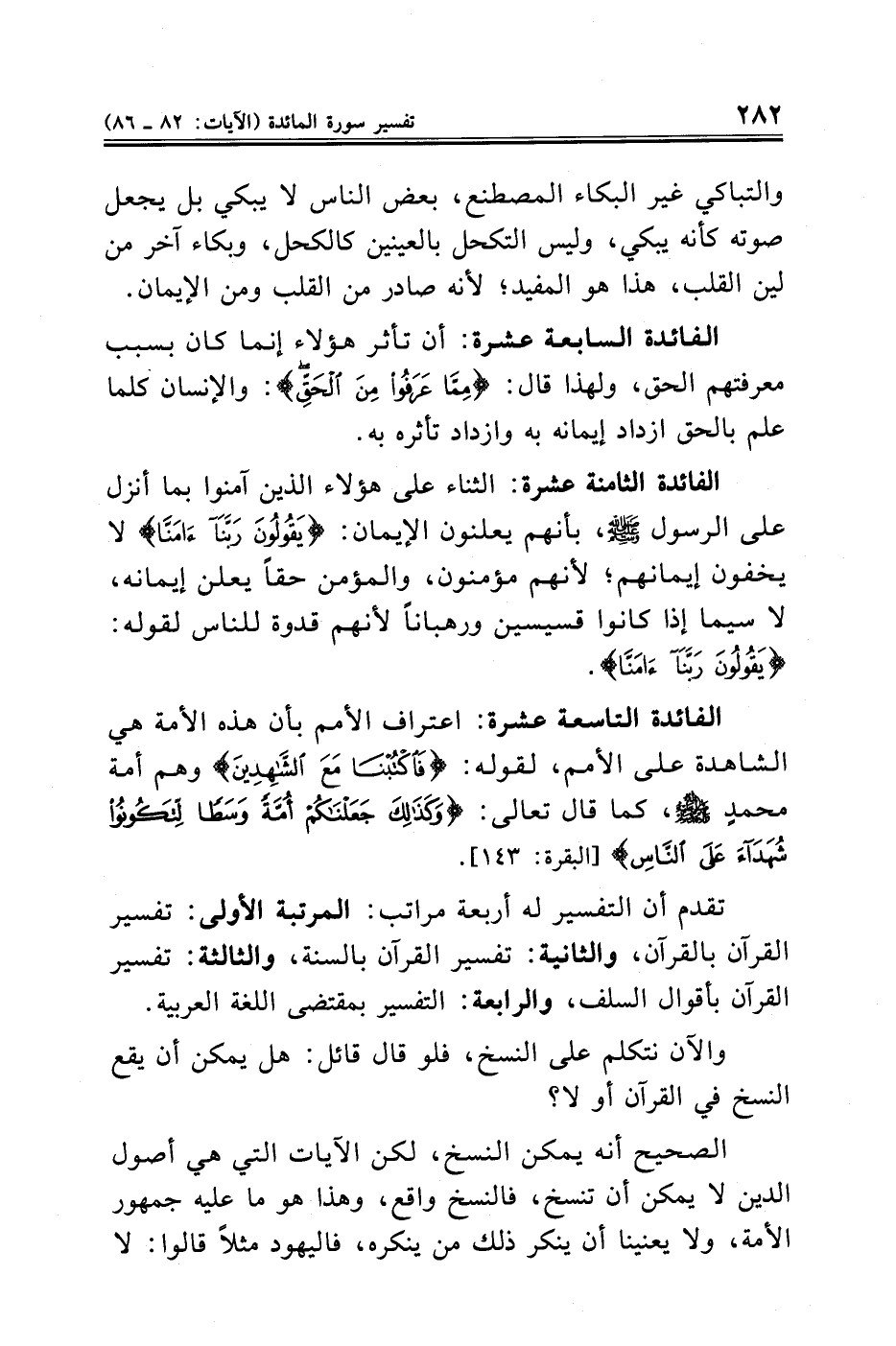 الفائدة الثامنة عشرة: الثناء على هؤلاء الذين آمنوا بما أنزل على الرسول - صلى الله عليه وسلم -، بأنهم يعلنون الإيمان: {يَقُولُونَ رَبَّنَا آمَنَّا} لا يخفون إيمانهم؛ لأنهم مؤمنون، والمؤمن حقًّا يعلن إيمانه، لا سيما إذا كانوا قسيسين ورهبانًا لأنهم قدوة للناس لقوله: {يَقُولُونَ رَبَّنَا آمَنَّا}.