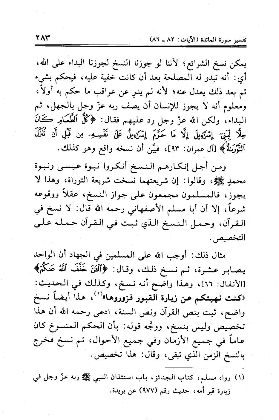 مثال ذلك: أوجب الله على المسلمين في الجهاد أن الواحد يصابر عشرة، ثم نسخ ذلك، وقال: {الْآنَ خَفَّفَ الله عَنْكُمْ} [الأنفال: ٦٦]، وهذا واضح أنه نسخ، وكذلك في الحديث: "كنت نهيتكم عن زيارة القبور فزوروها" (¬١)، هذا أيضًا نسخ واضح، ثبت بنص القرآن ونص السنة، ادعى رحمه الله أن هذا تخصيص وليس بنسخ، ووجَّه قوله: بأن الحكم المنسوخ كان عامًّا في جميع الأزمان وفي جميع الأحوال، ثم نسخ فخرج بالنسخ الزمن الذي تبقى، وقال: هذا تخصيص.
