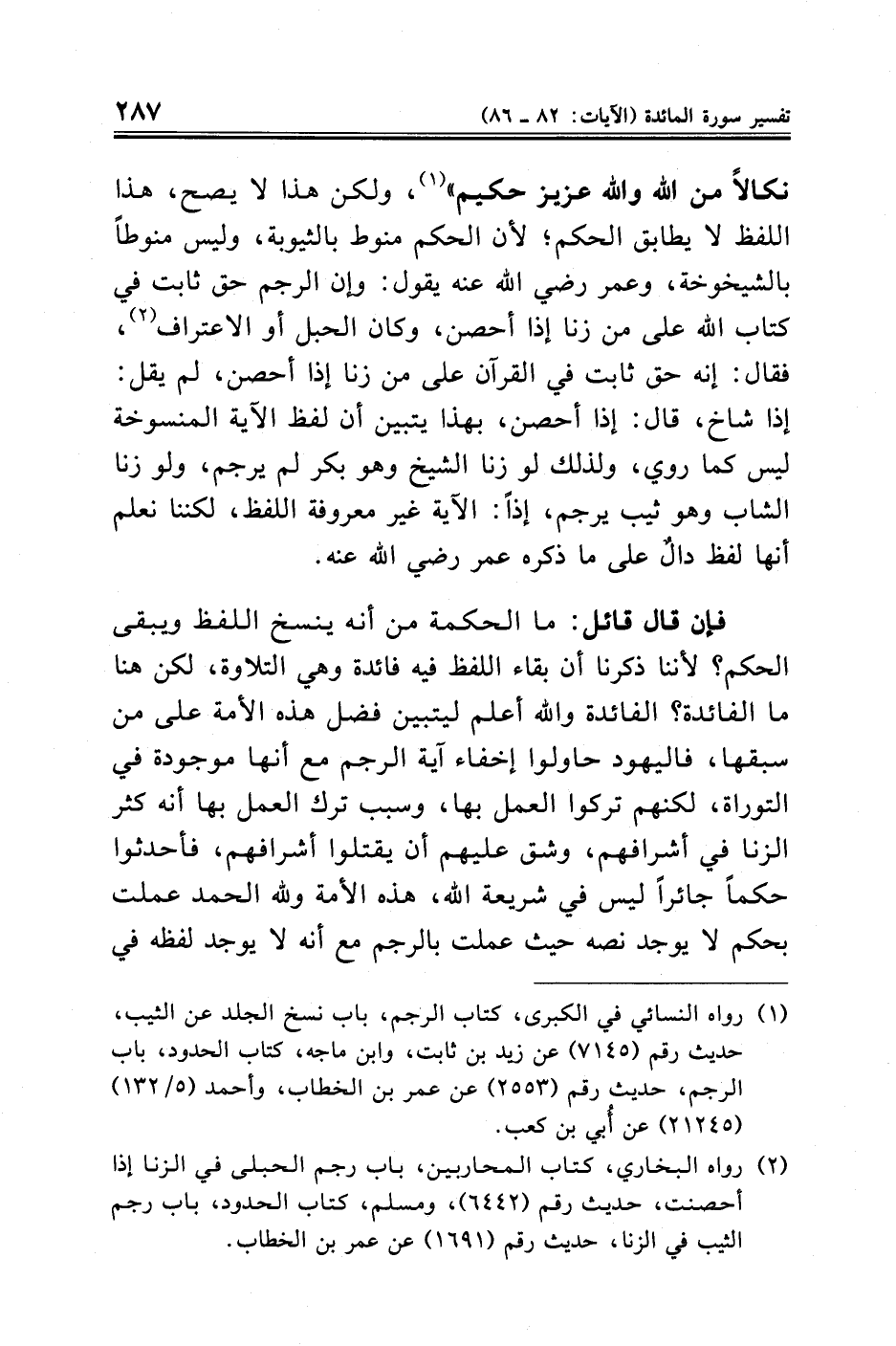 نكالًا من الله والله عزيز حكيم" (¬١)، ولكن هذا لا يصح، هذا اللفظ لا يطابق الحكم؛ لأن الحكم منوط بالثيوبة، وليس منوطًا بالشيخوخة، وعمر رضي الله عنه يقول: وإن الرجم حق ثابت في كتاب الله على من زنا إذا أحصن، وكان الحبل أو الاعتراف (¬٢)، فقال: إنه حق ثابت في القرآن على من زنا إذا أحصن، لم يقل: إذا شاخ، قال: إذا أحصن، بهذا يتبين أن لفظ الآية المنسوخة ليس كما روي، ولذلك لو زنا الشيخ وهو بكر لم يرجم، ولو زنا الشاب وهو ثيب يرجم، إذًا: الآية غير معروفة اللفظ، لكننا نعلم أنها لفظ دالٌّ على ما ذكره عمر رضي الله عنه.
