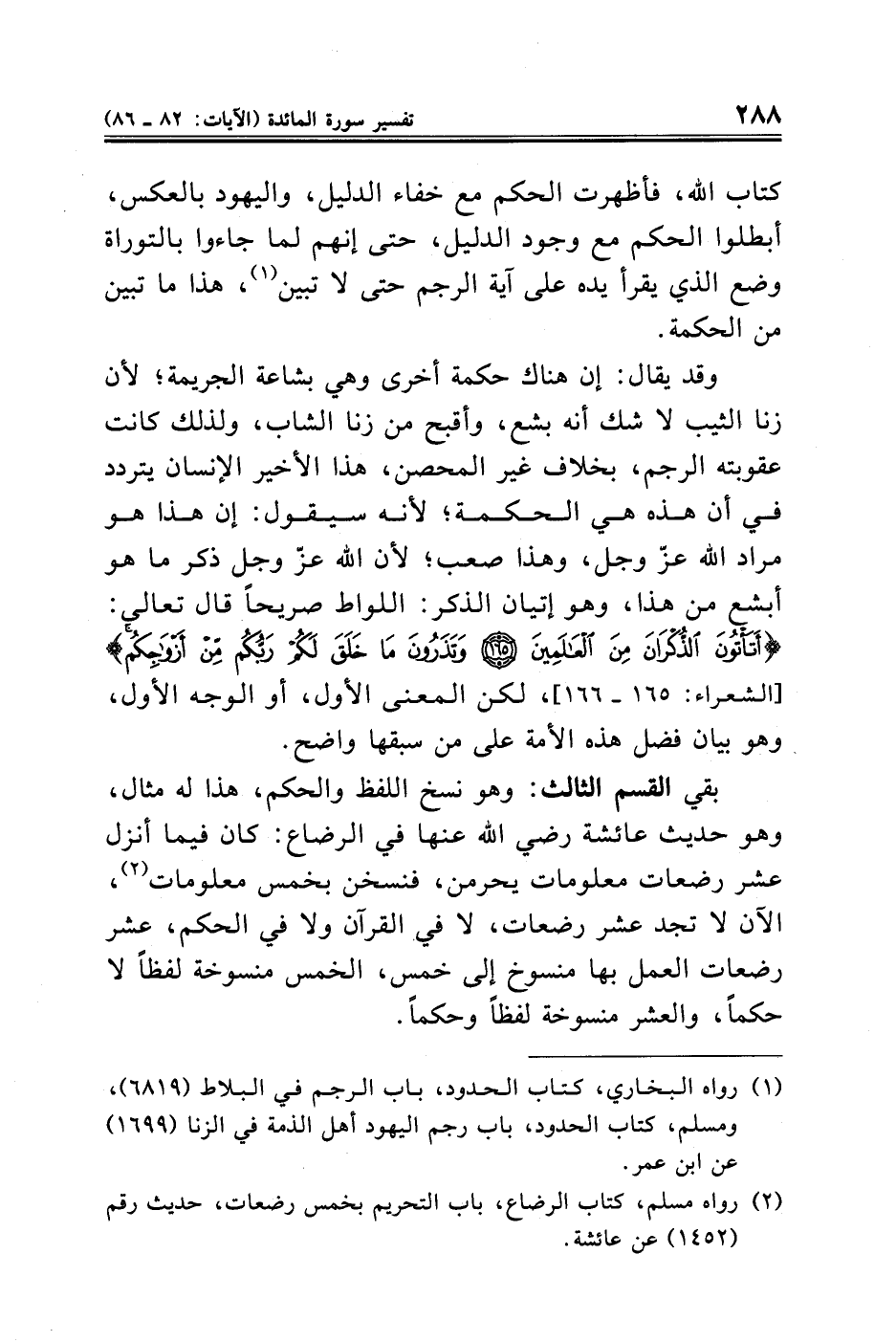 بقي القسم الثالث: وهو نسخ اللفظ والحكم، هذا له مثال، وهو حديث عائشة رضي الله عنها في الرضاع: كان فيما أنزل عشر رضعات معلومات يحرمن، فنسخن بخمس معلومات (¬٢)، الآن لا تجد عشر رضعات، لا في القرآن ولا في الحكم، عشر رضعات العمل بها منسوخ إلى خمس، الخمس منسوخة لفظًا لا حكمًا، والعشر منسوخة لفظًا وحكمًا.