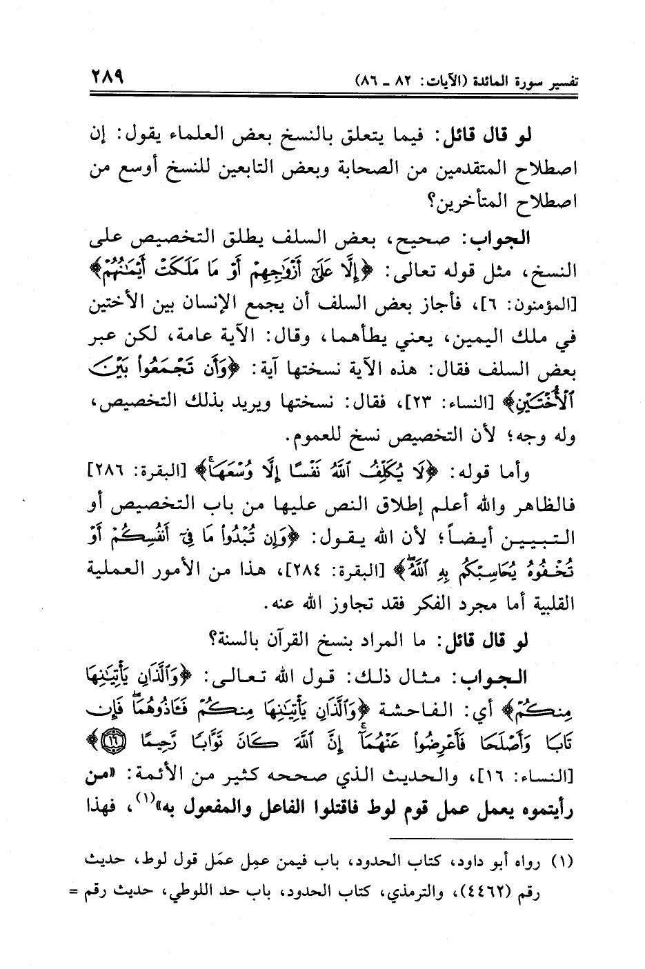 الجواب: مثال ذلك: قول الله تعالى: {وَاللَّذَانِ يَأْتِيَانِهَا مِنْكُمْ} أي: الفاحشة {وَاللَّذَانِ يَأْتِيَانِهَا مِنْكُمْ فَآذُوهُمَا فَإِنْ تَابَا وَأَصْلَحَا فَأَعْرِضُوا عَنْهُمَا إِنَّ اللَّهَ كَانَ تَوَّابًا رَحِيمًا (١٦)} [النساء: ١٦] , والحديث الذي صححه كثير من الأئمة: "من رأيتموه يعمل عمل قوم لوط فاقتلوا الفاعل والمفعول به" (¬١)، فهذا