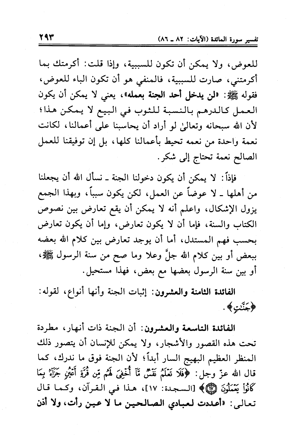 فإذًا: لا يمكن أن يكون دخولنا الجنة -نسأل الله أن يجعلنا من أهلها- لا عوضًا عن العمل، لكن يكون سببًا، وبهذا الجمع يزول الإشكال، واعلم أنه لا يمكن أن يقع تعارض بين نصوص الكتاب والسنة، فإما أن لا يكون تعارض، وإما أن يكون تعارض بحسب فهم المستدل، أما أن يوجد تعارض بين كلام الله بعضه ببعض أو بين كلام الله جلَّ وعلا وما صح من سنة الرسول - صلى الله عليه وسلم -، أو بين سنة الرسول بعضها مع بعض، فهذا مستحيل.