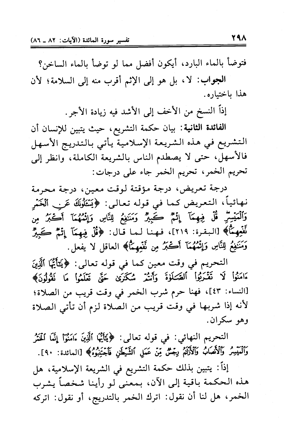 الفائدة الثانية: بيان حكمة التشريع، حيث يتبين للإنسان أن التشريع في هذه الشريعة الإسلامية يأتي بالتدريج الأسهل فالأسهل، حتى لا يصطدم الناس بالشريعة الكاملة، وانظر إلى تحريم الخمر، تحريم الخمر جاء على درجات: