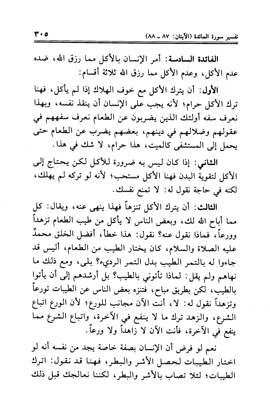 الفائدة السادسة: أمر الإنسان بالأكل مما رزق الله، ضده عدم الأكل، وعدم الأكل مما رزق الله ثلاثة أقسام: