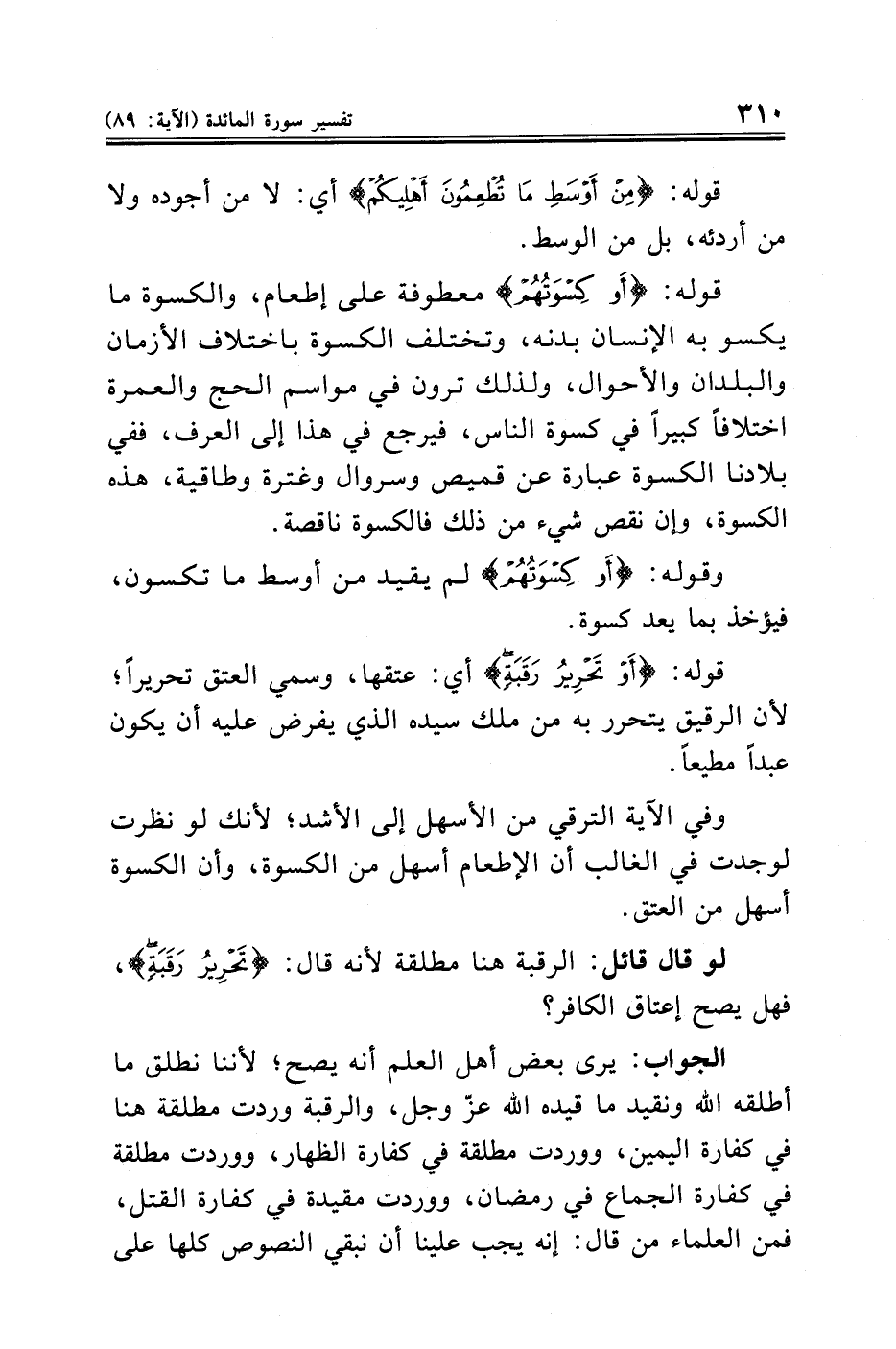 قوله: {أَوْ كِسْوَتُهُمْ} معطوفة على إطعام، والكسوة ما يكسو به الإنسان بدنه، وتختلف الكسوة باختلاف الأزمان والبلدان والأحوال. ولذلك ترون في مواسم الحج والعمرة اختلافًا كبيرًا في كسوة الناس، فيرجع في هذا إلى العرف، ففي بلادنا الكسوة عبارة عن قميص وسروال وغترة وطاقية، هذه الكسوة، وإن نقص شيء من ذلك فالكسوة ناقصة.