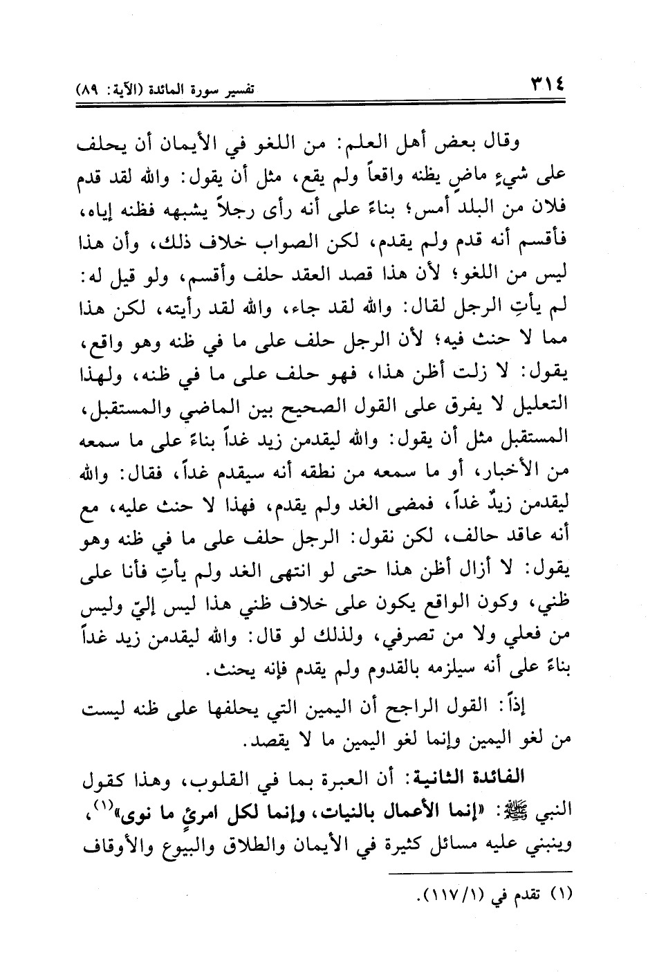 وقال بعض أهل العلم: من اللغو في الأيمان أن يحلف على شيءٍ ماضٍ يظنه واقعًا ولم يقع، مثل أن يقول: والله لقد قدم فلان من البلد أمس؛ بناءً على أنه رأى رجلًا يشبهه فظنه إياه، فأقسم أنه قدم ولم يقدم، لكن الصواب خلاف ذلك، وأن هذا ليس من اللغو؛ لأن هذا قصد العقد حلف وأقسم، ولو قيل له: لم يأتِ الرجل لقال: والله لقد جاء، والله لقد رأيته، لكن هذا مما لا حنث فيه؛ لأن الرجل حلف على ما في ظنه وهو واقع، يقول: لا زلت أظن هذا، فهو حلف على ما في ظنه، ولهذا التعليل لا يفرق على القول الصحيح بين الماضي والمستقبل، المستقبل مثل أن يقول: والله ليقدمن زيد غدًا بناءً على ما سمعه من الأخبار، أو ما سمعه من نطقه أنه سيقدم غدًا، فقال: والله ليقدمن زيدٌ غدًا، فمضى الغد ولم يقدم، فهذا لا حنث عليه، مع أنه عاقد حالف، لكن نقول: الرجل حلف على ما في ظنه وهو يقول: لا أزال أظن هذا حتى لو انتهى الغد ولم يأتِ فأنا على ظني، وكون الواقع يكون على خلاف ظني هذا ليس إليّ وليس من فعلي ولا من تصرفي، ولذلك لو قال: والله ليقدمن زيد غدًا بناءً على أنه سيلزمه بالقدوم ولم يقدم فإنه يحنث.
