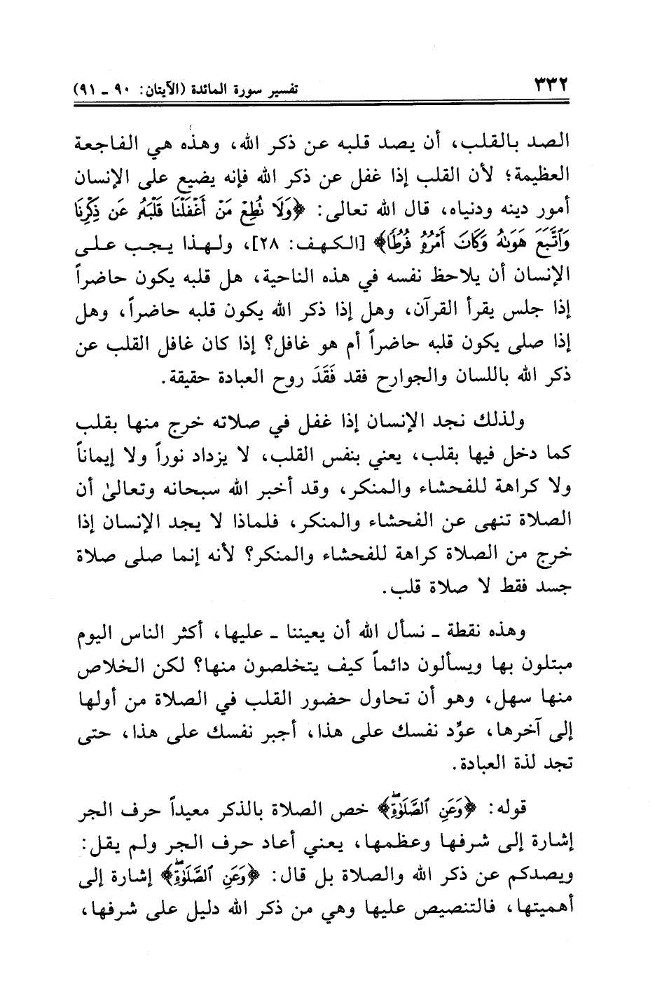 قوله: {وَعَنِ الصَّلَاةِ} خص الصلاة بالذكر معيدًا حرف الجر إشارة إلى شرفها وعظمها، يعني أعاد حرف الجر ولم يقل: ويصدكم عن ذكر الله والصلاة بل قال: {وَعَنِ الصَّلَاةِ} إشارة إلى أهميتها، فالتنصيص عليها وهي من ذكر الله دليل على شرفها،