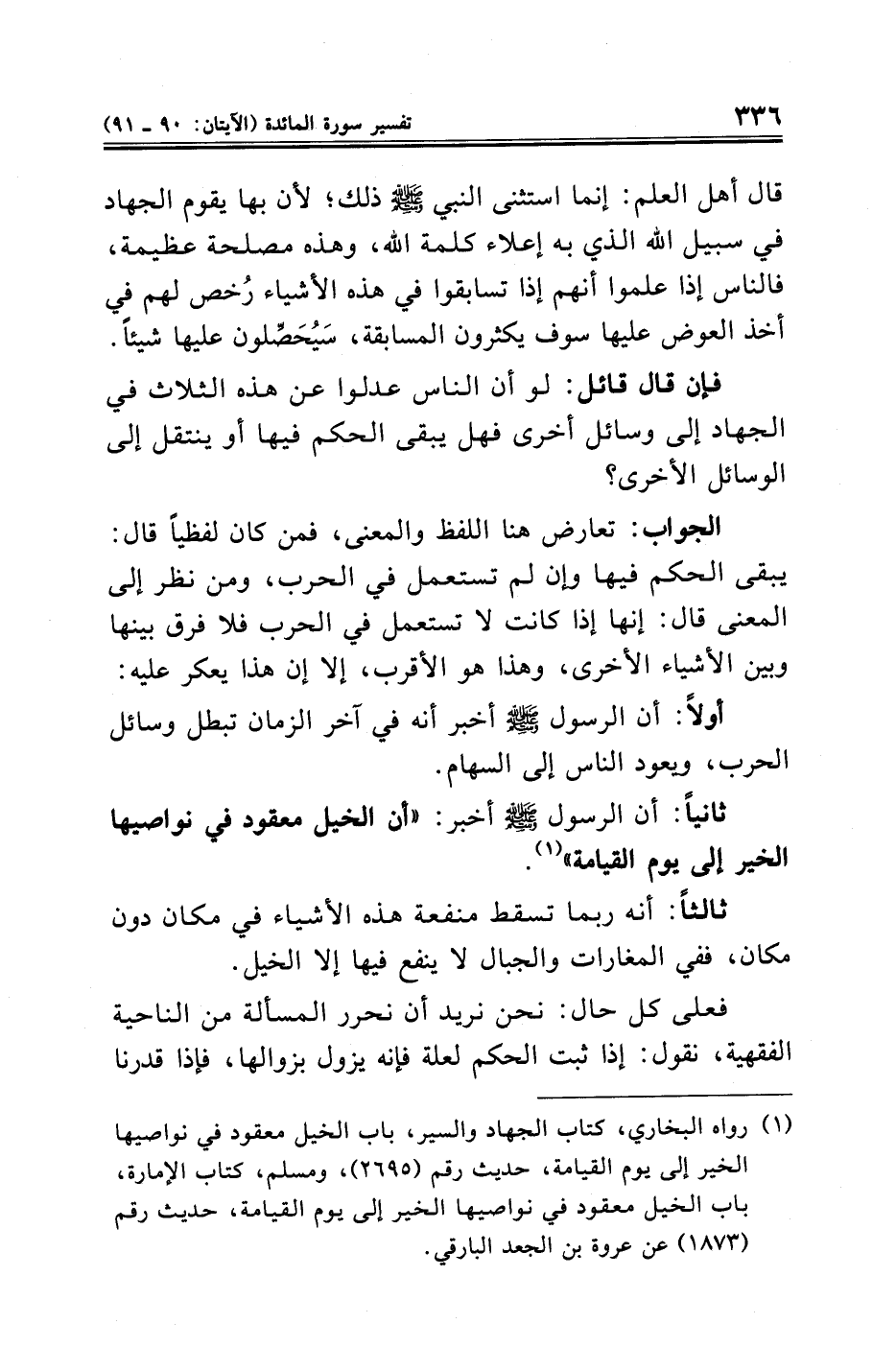 (¬١) رواه البخاري، كتاب الجهاد والسير، باب الخيل معقود في نواصيها الخير إلى يوم القيامة، حديث رقم (٢٦٩٥)، ومسلم، كتاب الإمارة، باب الخيل معقود في نواصيها الخير إلى يوم القيامة، حديث رقم (١٨٧٣) عن عروة بن الجعد البارقي.