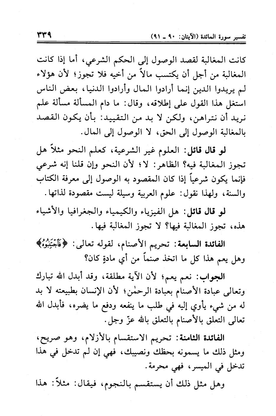 الفائدة الثامنة: تحريم الاستقسام بالأزلام، وهو صريح، ومثل ذلك ما يسمونه بحظك ونصيبك، فهي إن لم تدخل في هذا تدخل في الميسر، فهي محرمة.