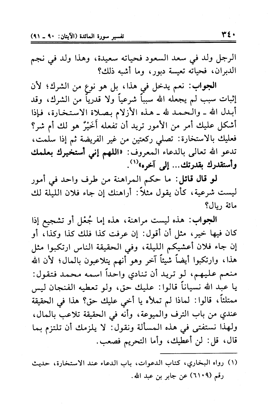 الجواب: نعم يدخل في هذا، بل هو نوع من الشرك؛ لأن إثبات سبب لم يجعله الله سببًا شرعيًّا ولا قدريا من الشرك، وقد أبدل الله -والحمد لله- هذه الأزلام بصلاة الاستخارة، فإذا أشكل عليك أمر من الأمور تريد أن تفعله أَخَيْر هو لك أم شر؟ فعليك بالاستخارة: تصلي ركعتين من غير الفريضة ثم إذا سلمت، تدعو الله تعالى بالدعاء المعروف: "اللهم إني أستخيرك بعلمك وأستقدرك بقدرتك ... إلى آخره" (¬١).