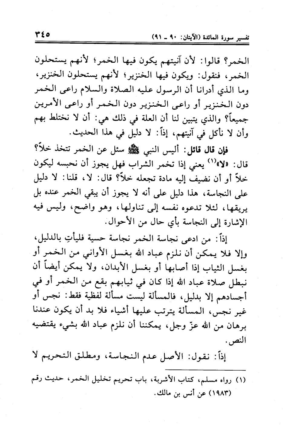 إذًا: من ادعى نجاسة الخمر نجاسة حسية فليأتِ بالدليل، وإلا فلا يمكن أن نلزم عباد الله بغسل الأواني من الخمر أو بغسل الثياب إذا أصابها أو بغسل الأبدان، ولا يمكن أيضًا أن نبطل صلاة عباد الله إذا كان في ثيابهم بقع من الخمر أو في أجسادهم إلا بدليل، فالمسألة ليست مسألة لفظية فقط: نجس أو غير نجس، المسألة يترتب عليها أشياء فلا بد أن يكون عندنا برهان من الله عزّ وجل، يمكننا أن نلزم عباد الله بشيء يقتضيه النص.