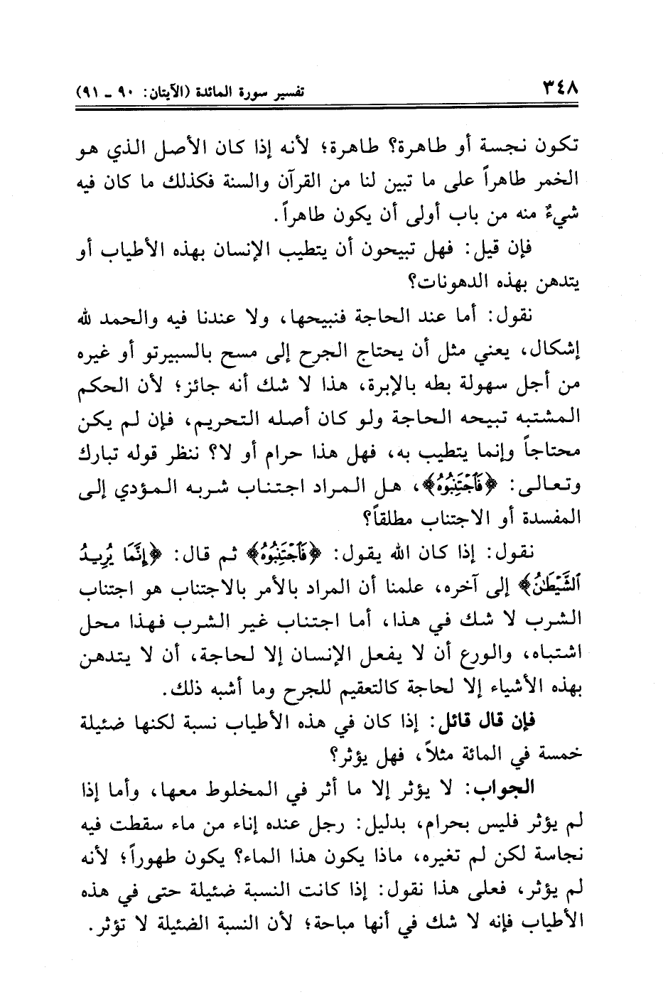 نقول: إذا كان الله يقول {فَاجْتَنِبُوهُ} ثم قال: {إِنَّمَا يُرِيدُ الشَّيْطَانُ} إلى آخره، علمنا أن المراد بالأمر بالاجتناب هو اجتناب الشرب لا شك في هذا، أما اجتناب غير الشرب فهذا محل اشتباه، والورع أن لا يفعل الإنسان إلا لحاجة، أن لا يتدهن بهذه الأشياء إلا لحاجة كالتعقيم للجرح وما أشبه ذلك.