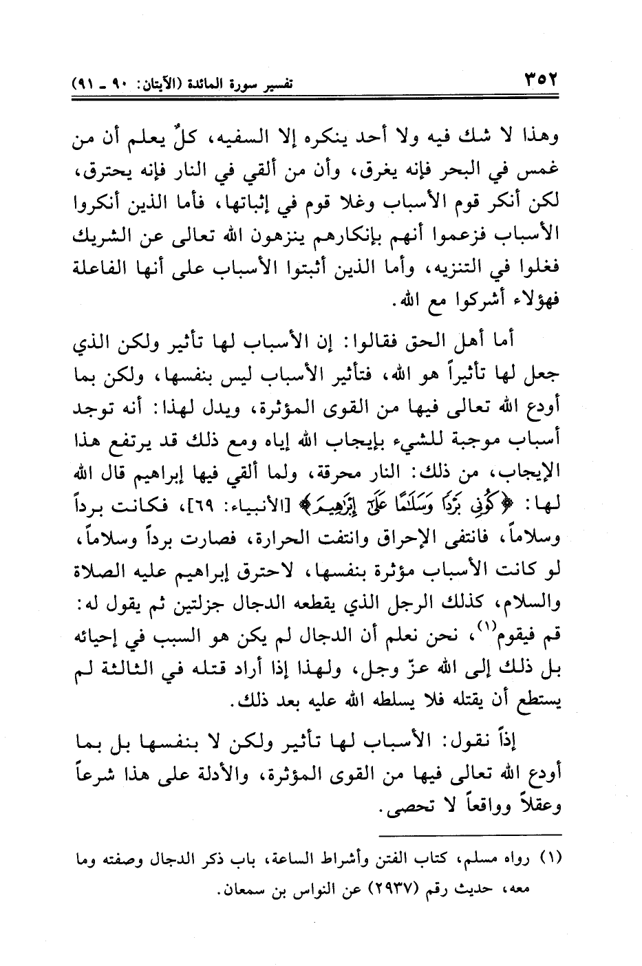 أما أهل الحق فقالوا: إن الأسباب لها تأثير ولكن الذي جعل لها تأثيرًا هو الله، فتأثير الأسباب ليس بنفسها، ولكن بما أودع الله تعالى فيها من القوى المؤثرة، ويدل لهذا: أنه توجد أسباب موجبة للشيء بإيجاب الله إياه ومع ذلك قد يرتفع هذا الإيجاب، من ذلك: النار محرقة، ولما ألقي فيها إبراهيم قال الله لها: {كُونِي بَرْدًا وَسَلَامًا عَلَى إِبْرَاهِيمَ} [الأنبياء: ٦٩]، فكانت بردًا وسلامًا، فانتفى الإحراق وانتفت الحرارة، فصارت بردًا وسلامًا، لو كانت الأسباب مؤثرة بنفسها، لاحترق إبراهيم عليه الصلاة والسلام، كذلك الرجل الذي يقطعه الدجال جزلتين ثم يقول له: قم فيقوم (¬١)، نحن نعلم أن الدجال لم يكن هو السبب في إحيائه بل ذلك إلى الله عزّ وجل، ولهذا إذا أراد قتله في الثالثة لم يستطع أن يقتله فلا يسلطه الله عليه بعد ذلك.