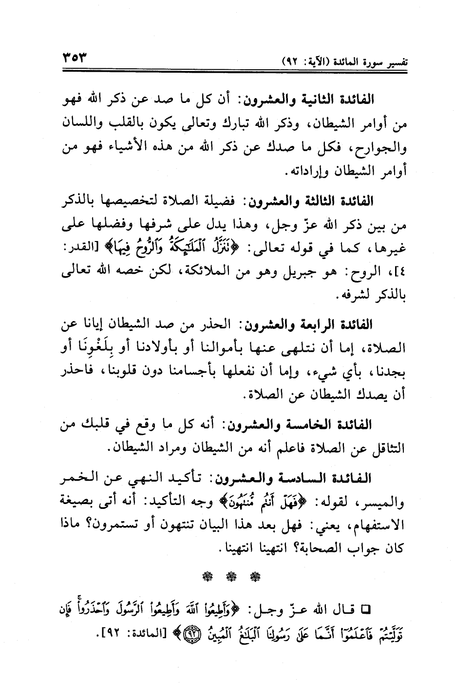 الفائدة الرابعة والعشرون: الحذر من صد الشيطان إيانا عن الصلاة، إما أن نتلهى عنها بأموالنا أو بأولادنا أو بِلَغْوِنَا أو بجدنا، بأي شيء، وإما أن نفعلها بأجسامنا دون قلوبنا، فاحذر أن يصدك الشيطان عن الصلاة.