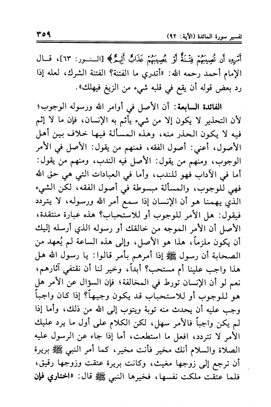 الفائدة السابعة: أن الأصل في أوامر الله ورسوله الوجوب؛ لأن التحذير لا يكون إلا من شيء يأثم به الإنسان، فإن ما لا إثم فيه لا يكون الحذر منه، وهذه المسألة فيها خلاف بين أهل الأصول، أعني: أصول الفقه، فمنهم من يقول: الأصل في الأمر الوجوب، ومنهم من يقول: الأصل فيه الندب، ومنهم من يقول: أما في الآداب فهو للندب، وأما في العبادات التي هي حق الله فهي للوجوب، والمسألة مبسوطة في أصول الفقه، لكن الشيء الذي يهمنا هو أن الإنسان إذا سمع أمر الله ورسوله، لا يتردد فيقول: هل الأمر للوجوب أو للاستحباب؟ هذه عبارة منتقدة، الأصل أن الأمر الموجه من خالقك أو رسوله الذي أرسله إليك أن يكون ملزمًا، هذا هو الأصل، وإلى هذه الساعة لم يُعهد من الصحابة أن رسول -صلى الله عليه وسلم- إذا أمرهم بأمر قالوا: يا رسول الله هل هذا واجب علينا أم مستحب؟ أبدًا، وخير لنا أن نقتفي آثارهم، نعم لو أن الإنسان تورط في المخالفة؛ فإن السؤال عن الأمر هل هو للوجوب أو للاستحباب قد يكون وجيهًا؟ إذا كان واجبًا وجب عليه أن يحدث منه توبة ويتوب إلى الله من ذلك، وأما إذا لم يكن واجبًا فالأمر سهل، لكن الكلام على أول ما يرد عليك الأمر لا تتردد، افعل ما استطعت، أما إذا جاء عن الرسول عليه الصلاة والسلام أنك مخير فأنت مخير، كما أمر النبي -صلى الله عليه وسلم- بريرة أن ترجع إلى زوجها مغيث، وكانت بريرة عتقت وزوجها رقيق، فلما عتقت ملكت نفسها، فخيرها النبي -صلى الله عليه وسلم- قال: "اختاري فإن