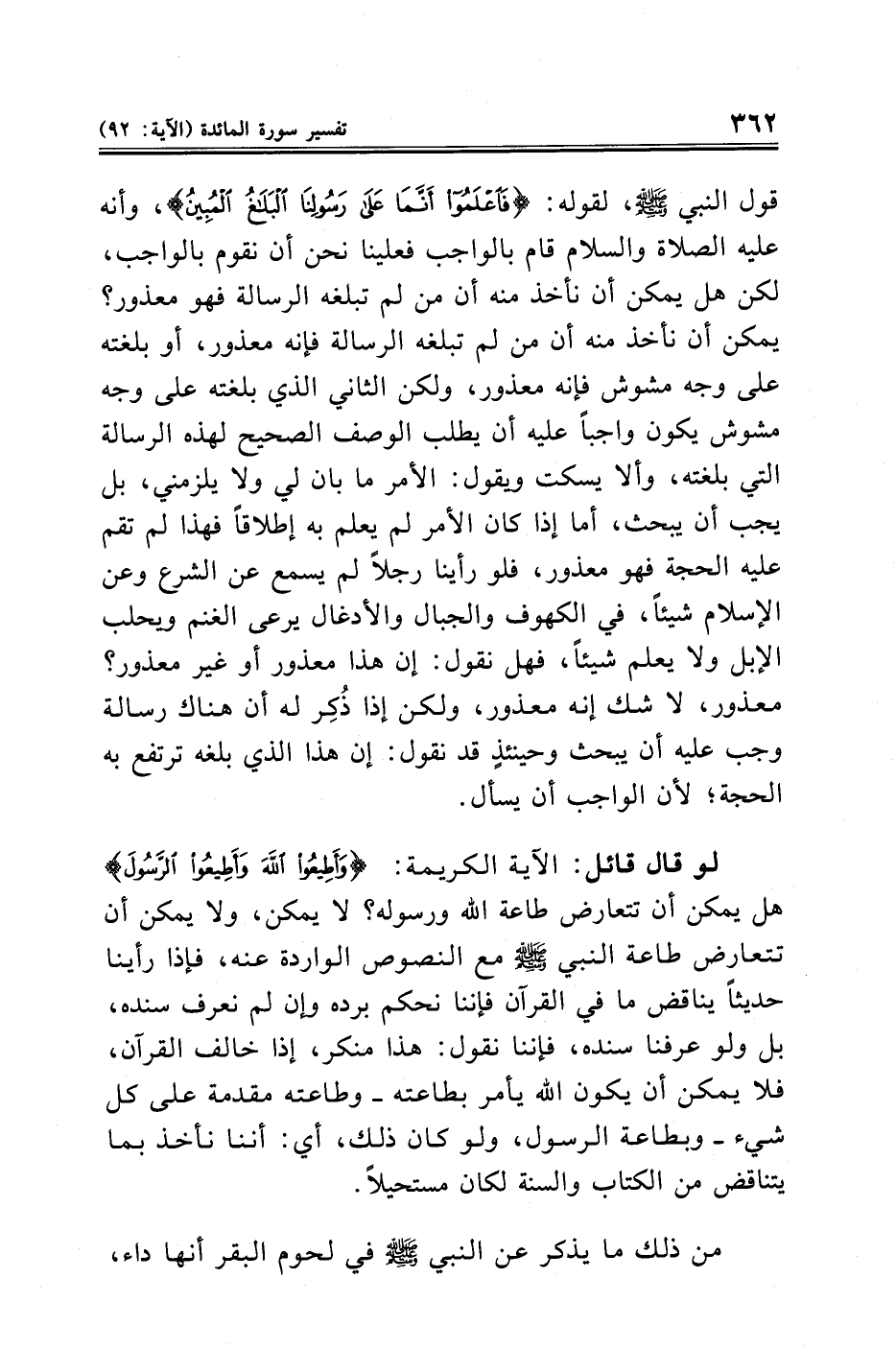 قول النبي -صلى الله عليه وسلم-، لقوله: {فَاعْلَمُوا أَنَّمَا عَلَى رَسُولِنَا الْبَلَاغُ الْمُبِينُ}، وأنه -عليه الصلاة والسلام- قام بالواجب فعلينا نحن أن نقوم بالواجب، لكن هل يمكن أن نأخذ منه أن من لم تبلغه الرسالة فهو معذور؛ يمكن أن نأخذ منه أن من لم تبلغه الرسالة فإنه معذور، أو بلغته على وجه مشوش فإنه معذور، ولكن الثاني الذي بلغته على وجه مشوش يكون واجبًا عليه أن يطلب الوصف الصحيح لهذه الرسالة التي بلغته، وألا يسكت ويقول: الأمر ما بان لي ولا يلزمني، بل يجب أن يبحث، أما إذا كان الأمر لم يعلم به إطلاقًا فهذا لم تقم عليه الحجة فهو معذور، فلو رأينا رجلًا لم يسمع عن الشرع وعن الإسلام شيئًا، في الكهوف والجبال والأدغال يرعى الغنم ويحلب الإبل ولا يعلم شيئًا، فهل نقول: إن هذا معذور أو غير معذور؛ معذور، لا شك إنه معذور، ولكن إذا ذُكِر له أن هناك رسالة وجب عليه أن يبحث وحينئذٍ قد نقول: إن هذا الذي بلغه ترتفع به الحجة؛ لأن الواجب أن يسأل.