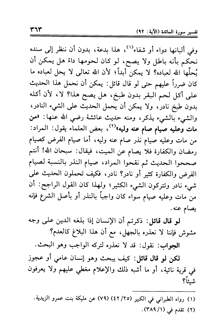 وفي ألبانها دواء أو شفاء (¬١)، هذا بدعة، بدون أن ننظر إلى سنده نحكم بأنه باطل ولا يصح، لو كان لحومها داءً هل يمكن أن يُحلَّها الله لعباده؟ لا يمكن أبدًا؛ لأن الله تعالى لا يحل لعباده ما كان ضررًا عليهم حتى لو قال قائل: يمكن أن نحمل هذا الحديث على أكل لحم البقر بدون طبخ، هل يصح هذا؟ لا، لأن أكله بدون طبخ نادر، ولا يمكن أن يحمل الحديث على الشيء النادر، والشيء بالشيء يذكر، ومنه حديث عائشة رضي الله عنها: "من مات وعليه صيام صام عنه وليه" (¬٢)، بعض العلماء يقول: المراد: من مات وعليه صيام نذر صام عنه وليه، أما صيام الفرض كصيام رمضان والكفارة فلا يصام عن الميت، فيقال: سبحان الله! أنتم صححوا الحديث ثم نقحوا المراد، صيام النذر بالنسبة لصيام الفرض والكفارة كثير أو نادر؟ نادر، فكيف تحملون الحديث على شيء نادر وتتركون الشيء الكثير؛ ولهذا كان القول الراجح: أن من مات وعليه صيام سواء كان واجبًا بالنذر أو بأصل الشرع فإنه يصام عنه.