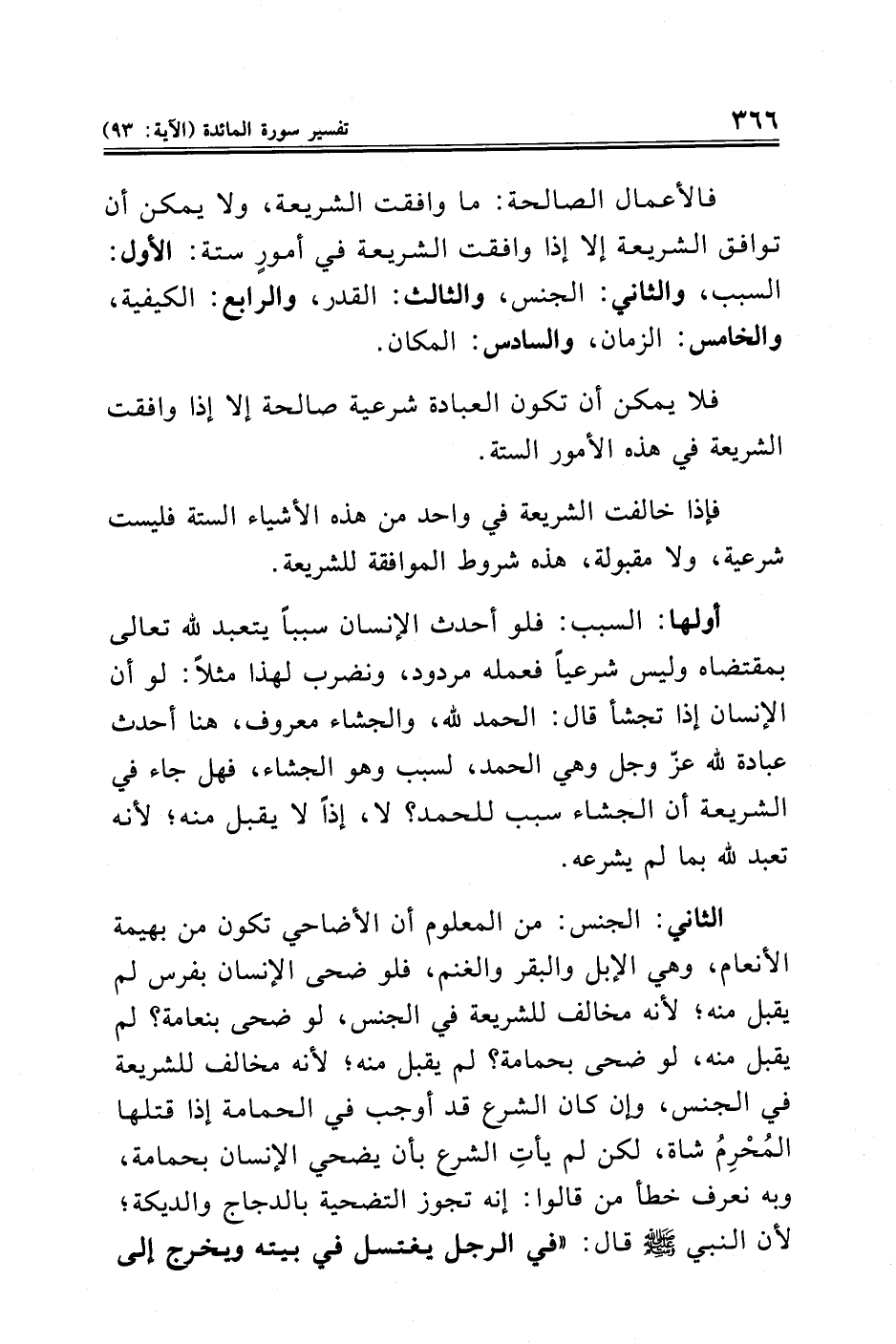 فالأعمال الصالحة: ما وافقت الشريعة، ولا يمكن أن توافق الشريعة إلا إذا وافقت الشريعة في أمورٍ ستة: الأول: السبب، والثاني: الجنس، والثالث: القدر، والرابع: الكيفية، والخامس: الزمان، والسادس: المكان.