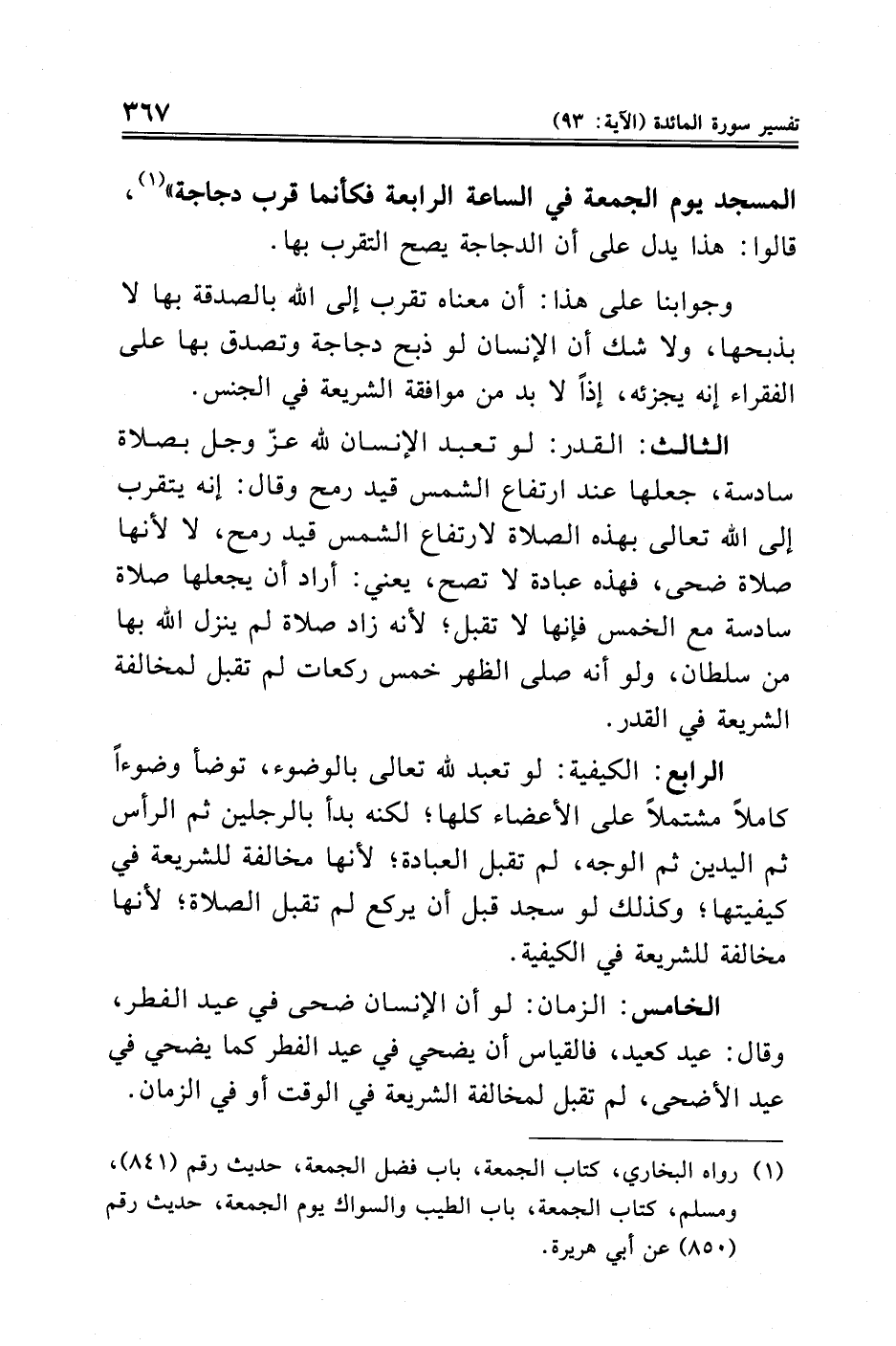 الخامس: الزمان: لو أن الإنسان ضحى في عيد الفطر، وقال: عيد كعيد، فالقياس أن يضحي في عيد الفطر كما يضحي في عيد الأضحى، لم تقبل لمخالفة الشريعة في الوقت أو في الزمان.