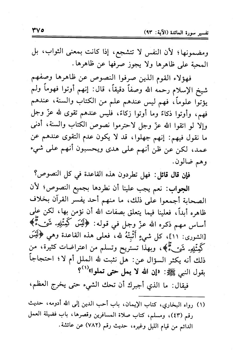 الجواب: نعم يجب علينا أن نطردها بجميع النصوص؛ لأن الصحابة أجمعوا على ذلك، ما منهم أحد يفسر القرآن بخلاف ظاهره أبدًا، فعلينا فيما يتعلق بصفات الله أن نؤمن بها، لكن على أساس مهم ذكره الله عزّ وجل في قوله: {لَيْسَ كَمِثْلِهِ شَيْءٌ} [الشورى: ١١]، كل شيءٍ أَثْبِتْهُ لله، فعلى هذه القاعدة وهي {لَيْسَ كَمِثْلِهِ شَيْءٌ}، وبهذا تستريح وتسلم من اعتراضات كثيرة، من ذلك أنه يكثر السؤال عن: هل نثبت لله الملل أم لا؛ احتجاجًا بقول النبي -صلى الله عليه وسلم-: "إن الله لا يمل حتى تملوا" (¬١)؟