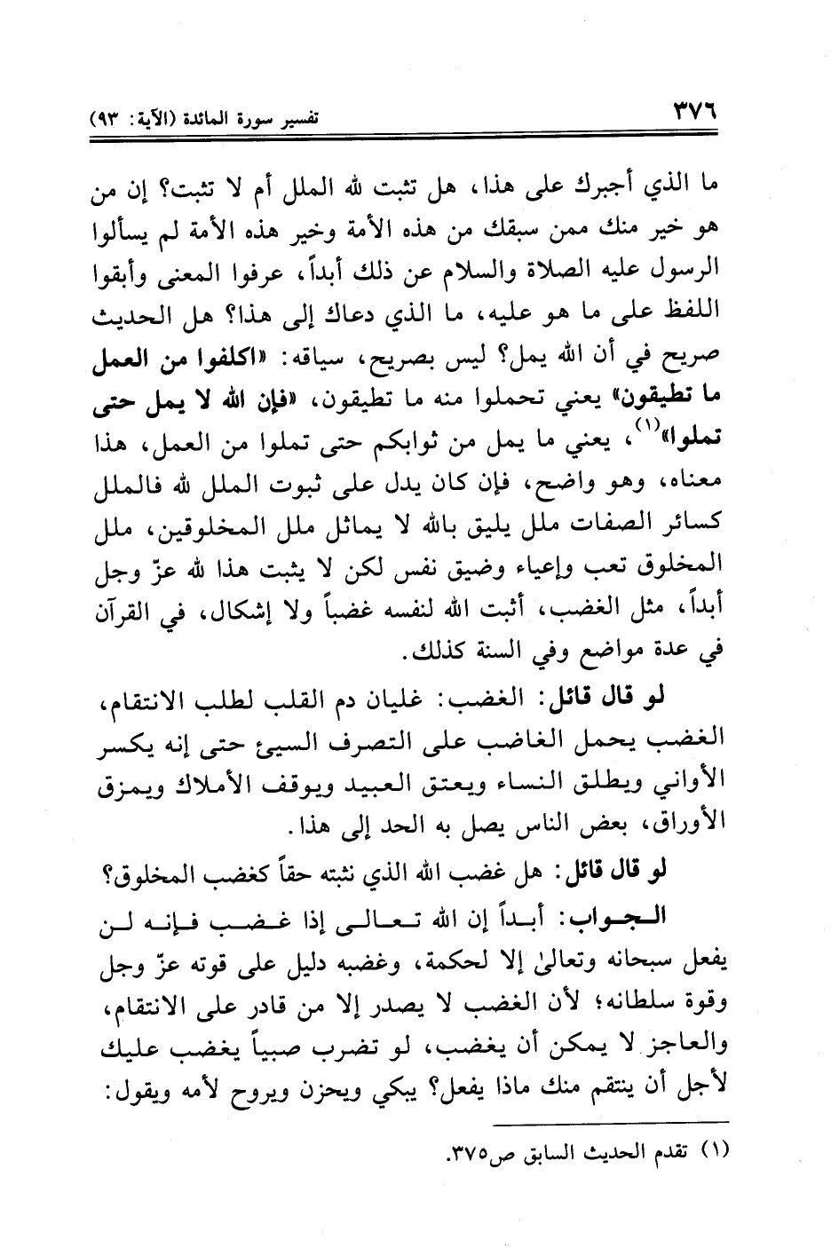 ما الذي أجبرك على هذا، هل تثبت لله الملل أم لا تثبت؟ إن من هو خير منك ممن سبقك من هذه الأمة وخير هذه الأمة لم يسألوا الرسول -عليه الصلاة والسلام- عن ذلك أبدًا، عرفوا المعنى وأبقوا اللفظ على ما هو عليه، ما الذي دعاك إلى هذا؟ هل الحديث صريح في أن الله يمل؟ ليس بصريح، سياقه: "اكلفوا من العمل ما تطيقون" يعني تحملوا منه ما تطيقون، "فإن الله لا يمل حتى تملوا" (¬١)، يعني ما يمل من ثوابكم حتى تملوا من العمل، هذا معناه، وهو واضح، فان كان يدل على ثبوت الملل لله فالملل كسائر الصفات ملل يليق بالله لا يماثل ملل المخلوقين، ملل المخلوق تعب وإعياء وضيق نفس لكن لا يثبت هذا لله عزّ وجل أبدًا، مثل الغضب، أثبت الله لنفسه غضبًا ولا إشكال، في القرآن في عدة مواضع وفي السنة كذلك.
